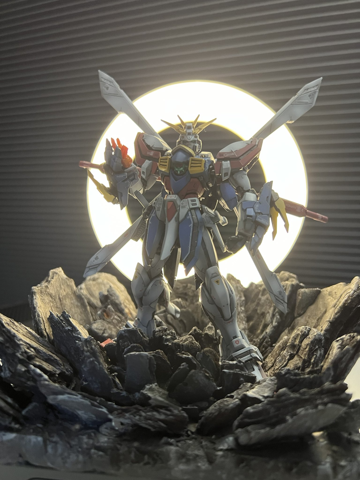 酒吧「 COMICBAR」經營者「天空のザイツ・トモハル」(@tomoharuzaitsu)就找到了可以完美運用環形補光燈的方法,不過拍攝主角不是自己而是鋼普拉。首先他將《機動武鬥傳G鋼彈》的主角機「神威鋼彈」鋼普拉拿出來放在布置好的場地上,神威鋼彈在進入「極致模式」(HYPER MODE)的時候身後會出現一道光輪,戰鬥能力也會大增。而要呈現這光輪不用另外拿零件,只要用環形補光燈放在鋼普拉後面就...完成了。