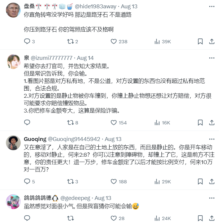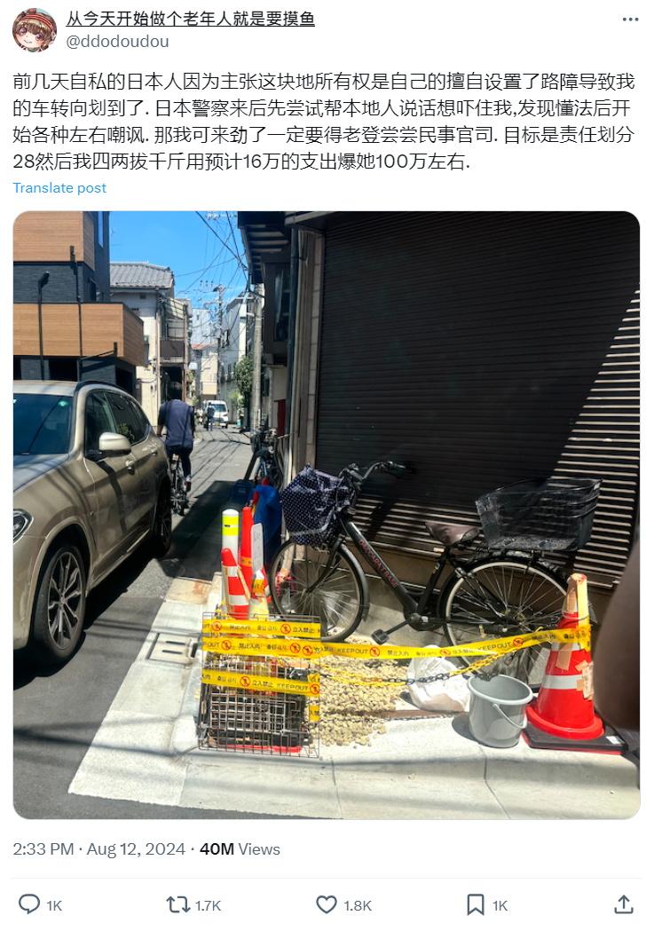 一名使用簡體中文發文的推主 ( 應該是中國人 ),在 X 上表示自己在日本開車時因未注意與當地住戶設置的心機石發生擦撞,由於地主主張設置的地權是他所有,後續就算找來警察處理卻不得推主所理解。認為是住戶設立路障刻意造成擦撞,發文表示自己一定要以法律途徑劃分賠償。
