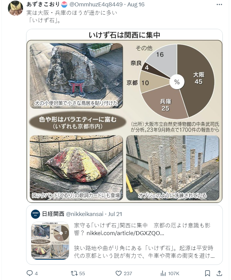 雖說發生的地方未說明是否在京都,不過另有日本網友轉推這篇文引起關注,認為這對京都人來說非常平常,畢竟在京都的住宅區很常見到「心機石」這樣的東西。