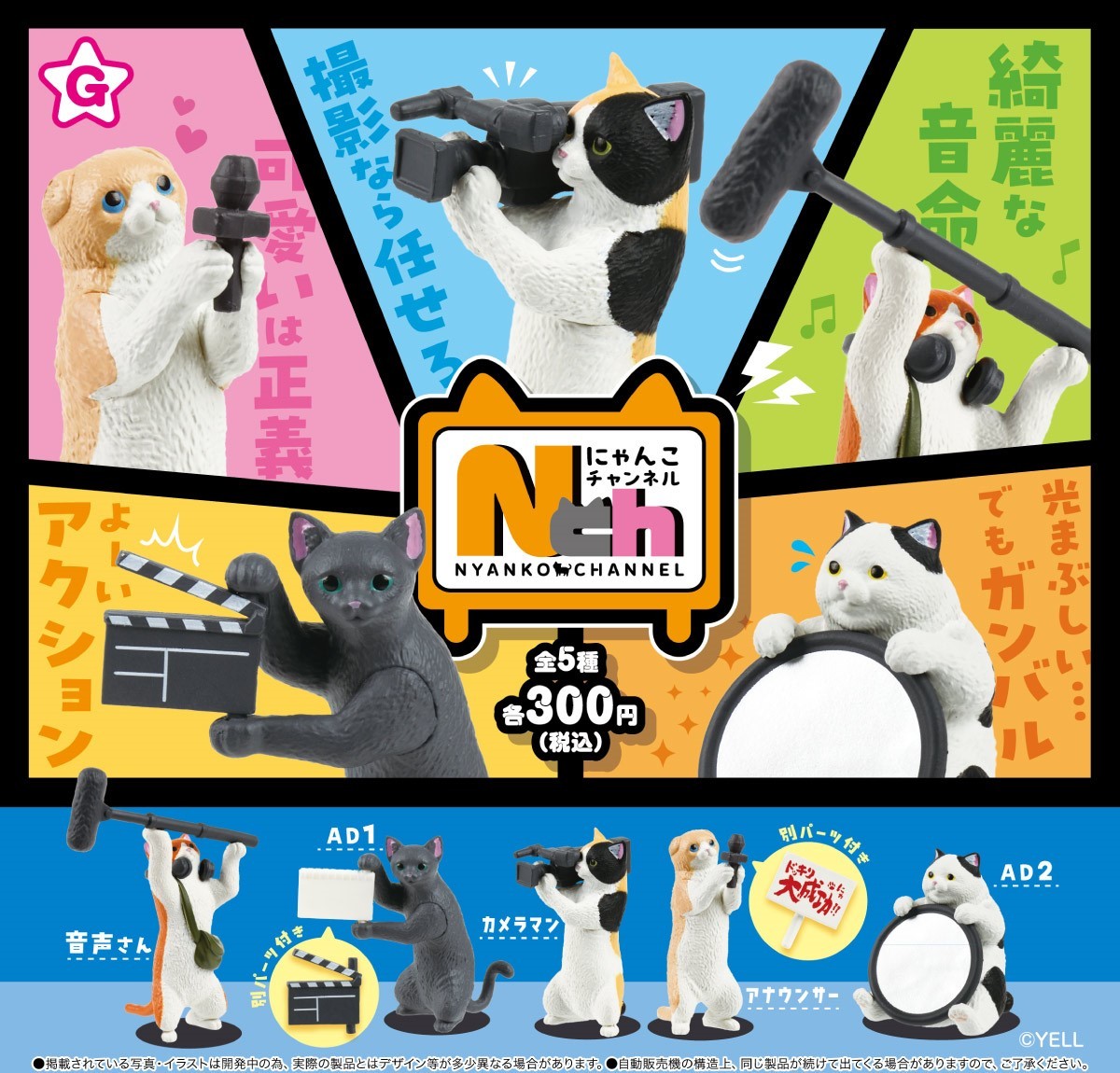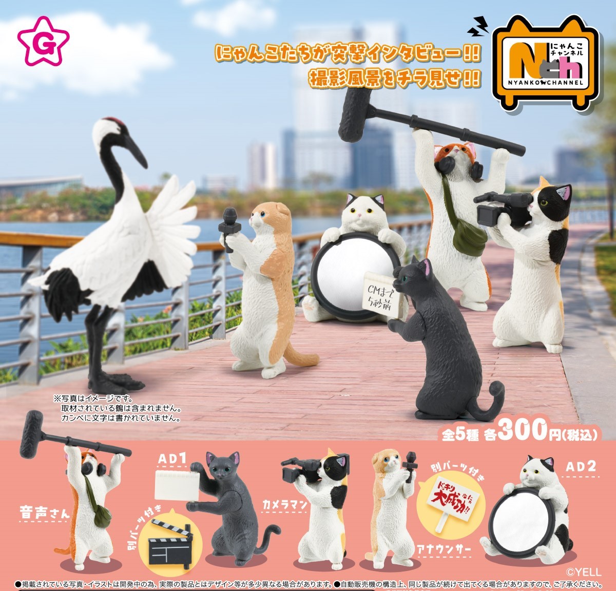 YELL「貓咪頻道」轉蛋,是一群自己工作賺罐頭錢的貓咪們,他們拍攝自己的節目,上山下海出外景採訪,帶來各種新鮮趣味的消息...分別有:可愛即是正義的貓咪採訪員、貓咪攝影大哥、貓咪收音師、拿場記板的 貓咪AD 1、負責反光板的貓咪AD 2,可愛還原他們認真工作的身影!此外,為了能拍攝更豐富的節目,採訪員手中的麥克風可以替換成手板,場記板也可以換成小字板!快來報導最新的轉蛋新聞吧~~