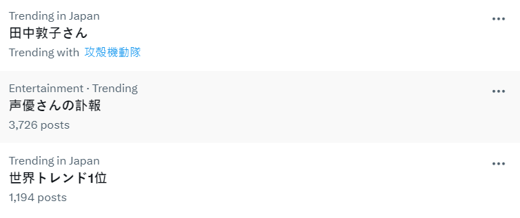 田中敦子死訊今日傳出後,不少粉絲立即在 X 上悼念,感謝她多年來效力配音界,陪伴所有喜歡動畫的粉絲及留下不少美好回憶。