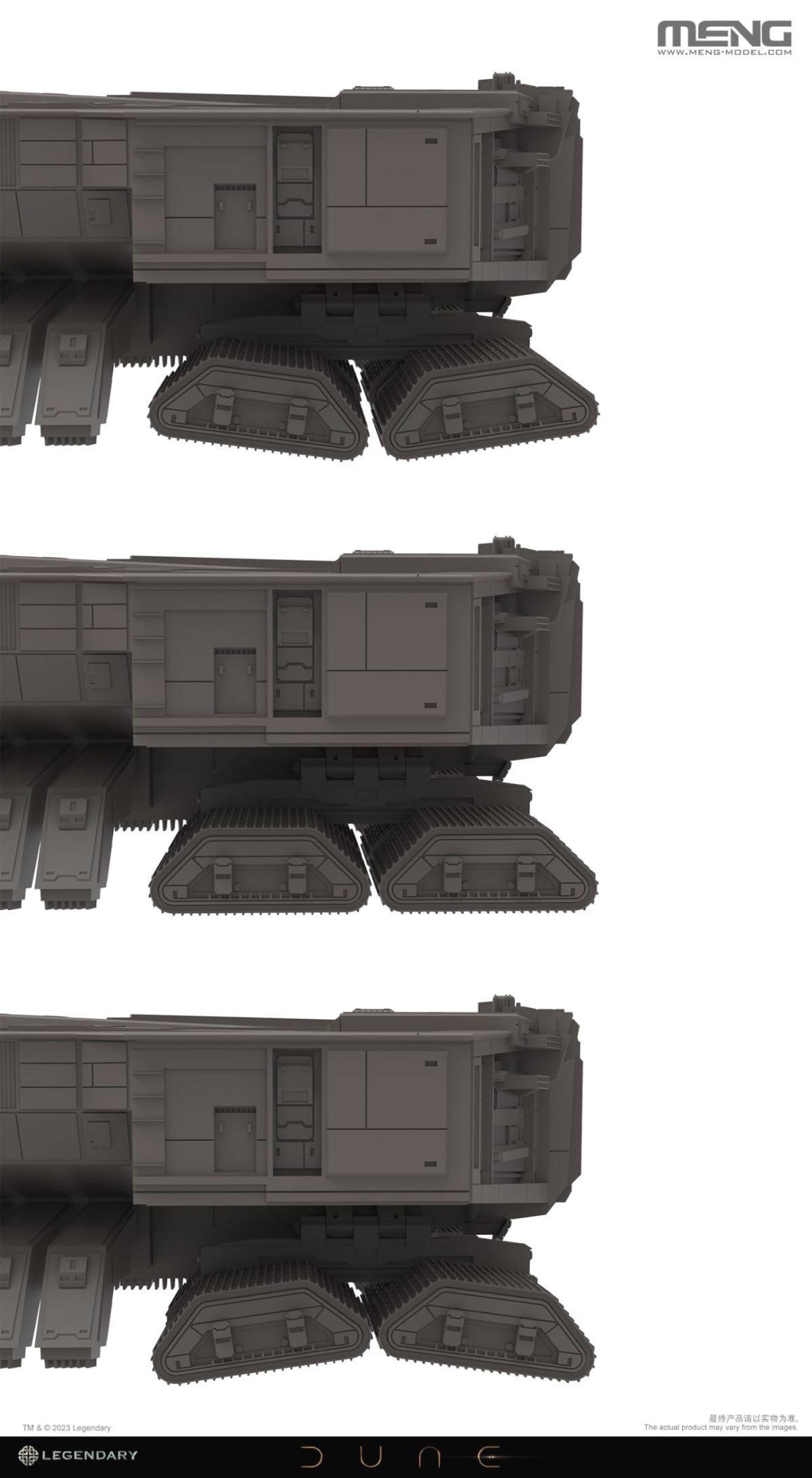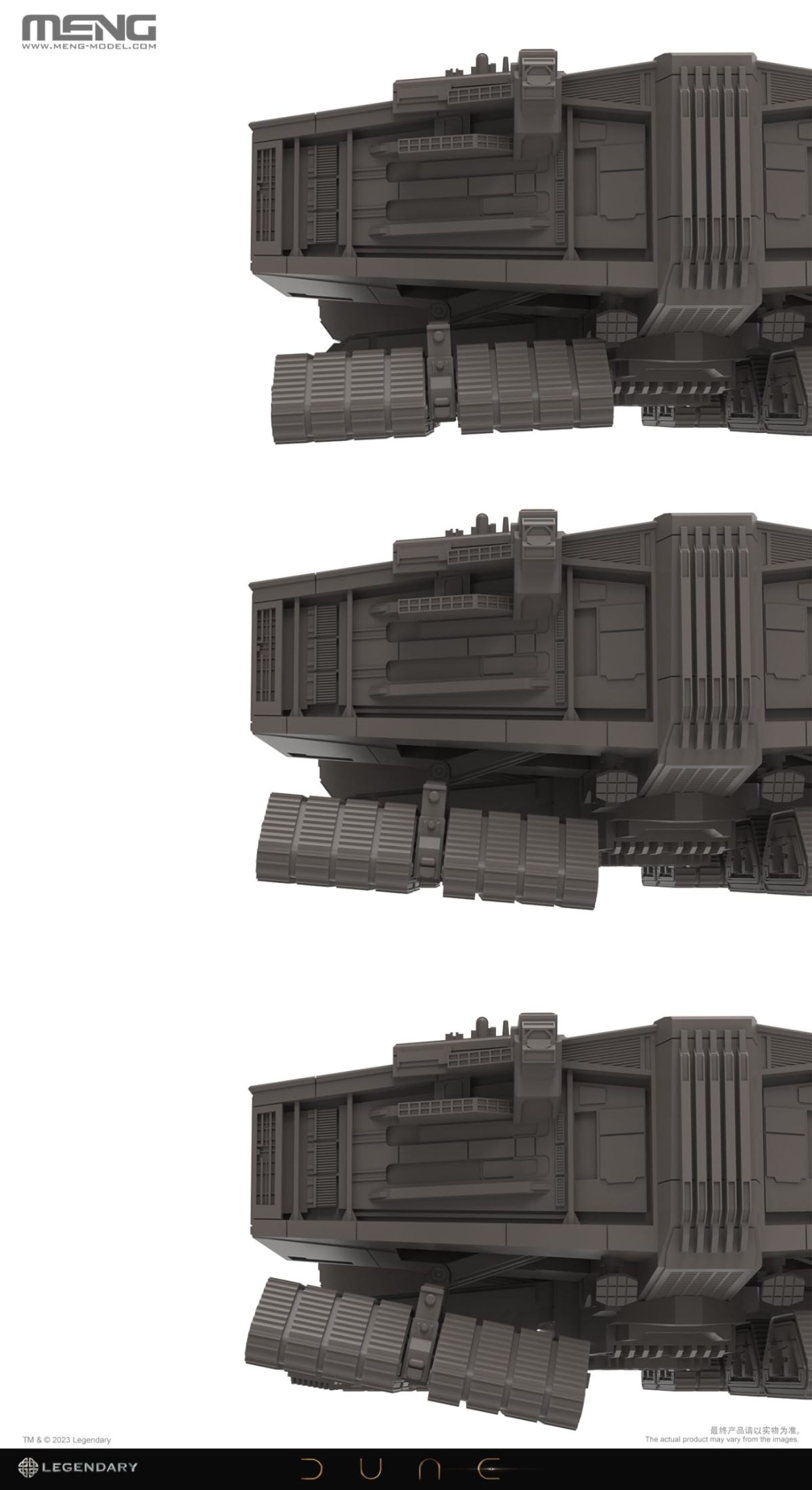 本次的香料收割機無比例組裝模型經傳奇影業授權,在組裝完成後全長約 20 公分,在縮小的比例下重現香料收割機充滿份量感的機體造型,雕刻還原各式機械構造與細節,底部 16 組履帶作有可動機構,能夠前後左右的擺動,重現依據地形變動的模樣!