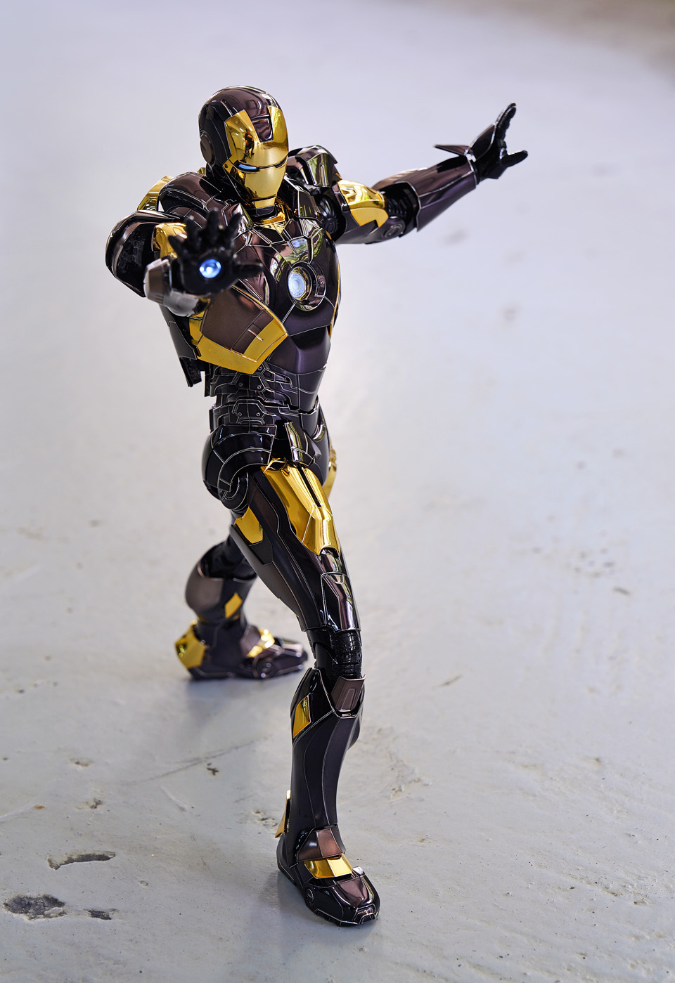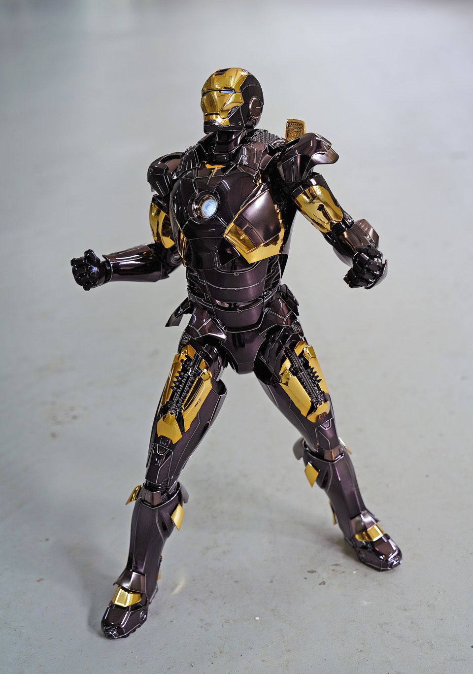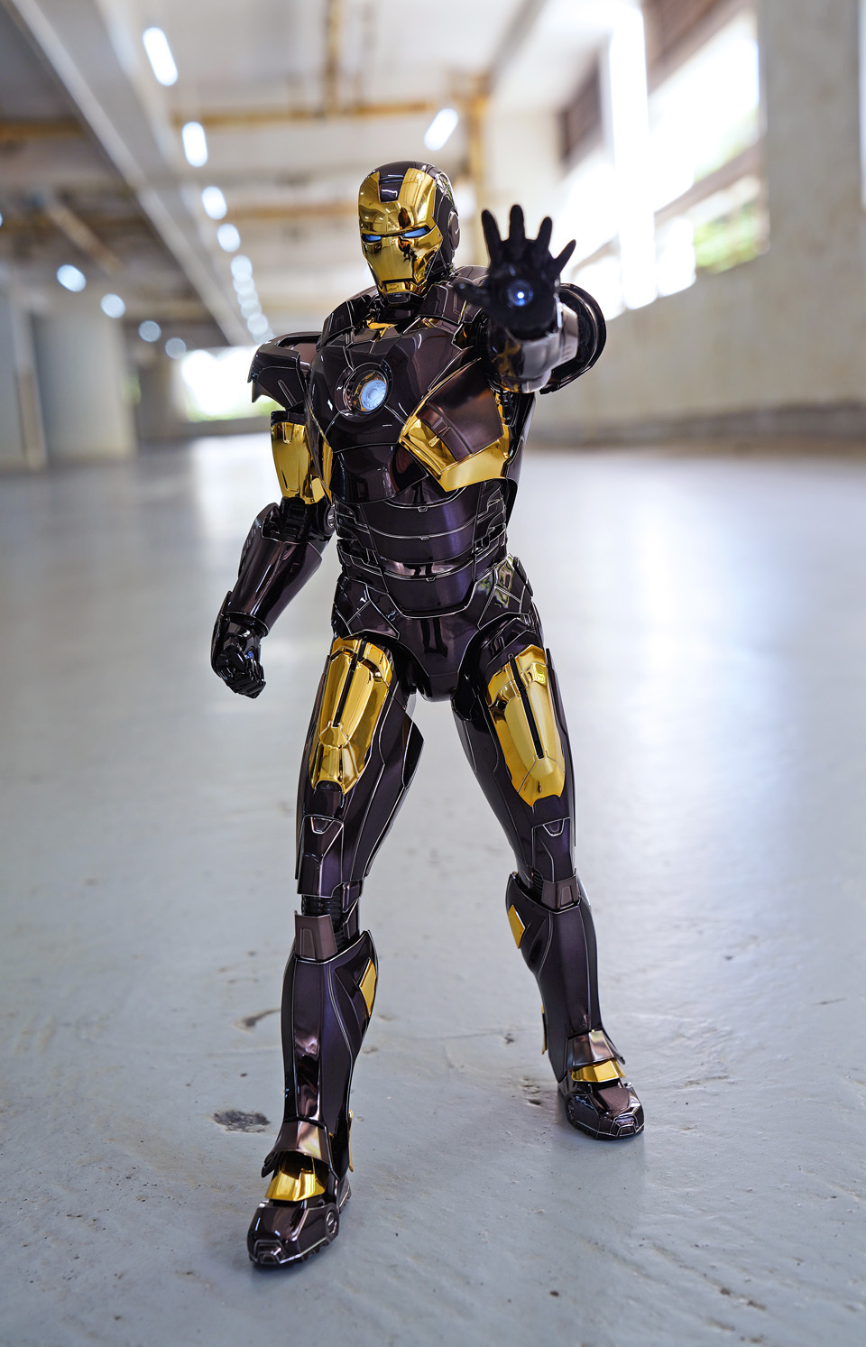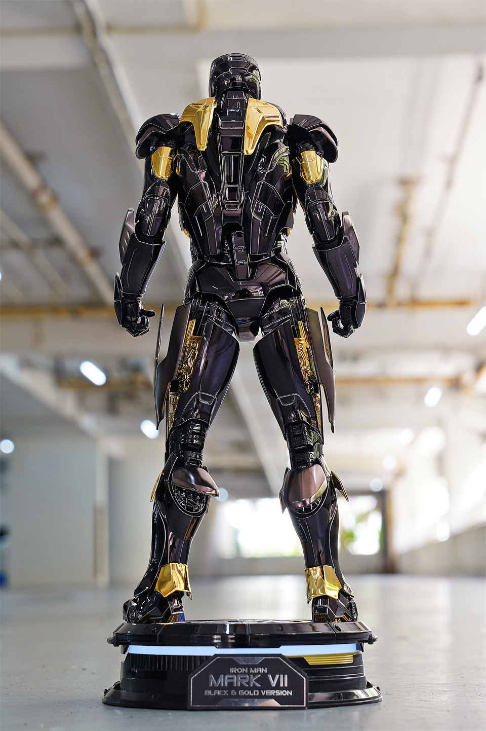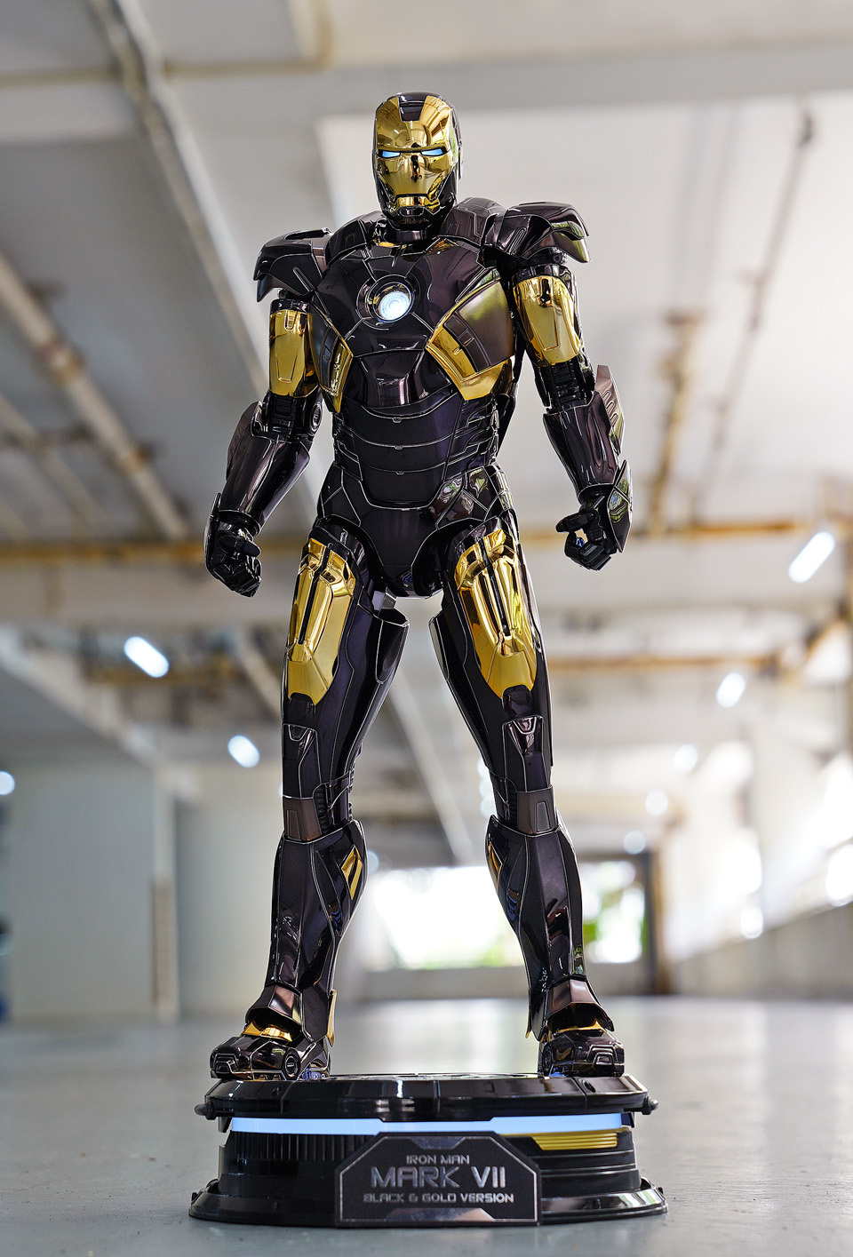 為慶祝漫威85周年的大日子, Hot Toys 推出鐵甲奇俠 Mark VII (黑金電鍍版) 1:6 比例合金珍藏人偶!運用了多層次電鍍上色塗裝技術,於甲件表面鍍上深淺色澤及光啞度不同的鋼鐵黑色和豪華金色,打造出亮鉑金屬色質感的搶眼外觀。同時根據電影 Mark VII 的規格,採用合金素材製作高約 32.5cm、結合流線機械身形比例的裝甲素體。全身多達30個可動關節;於圓形的胸口反應器、雙眼及掌心裝置 LED 亮燈功能可綻放白色光芒,營造極佳視覺效果。
