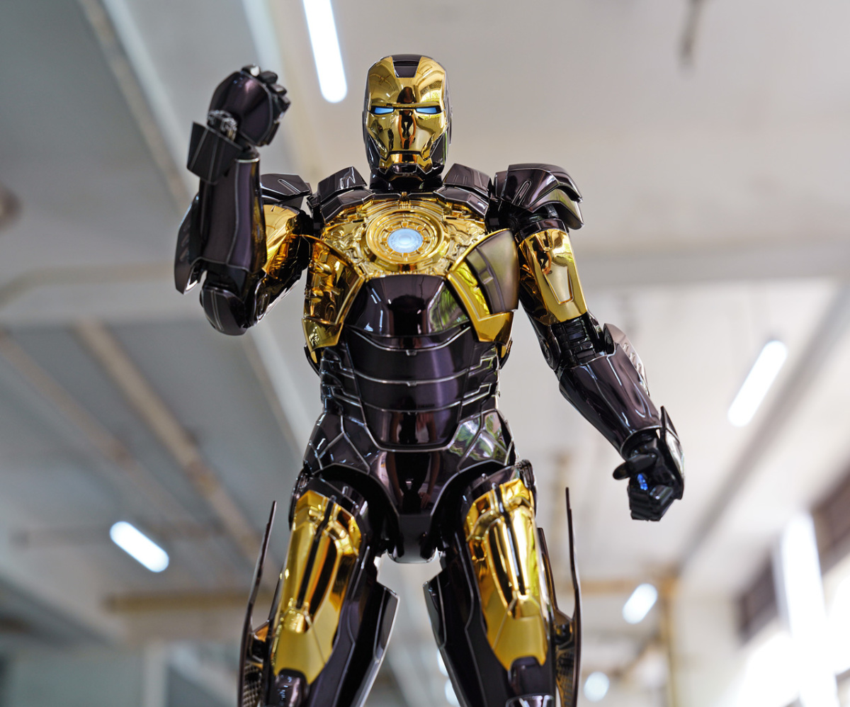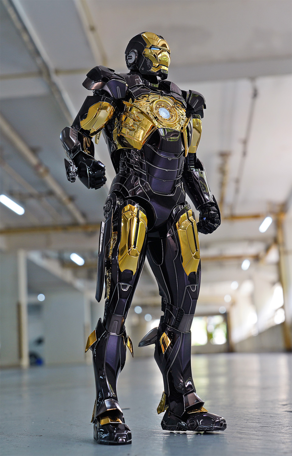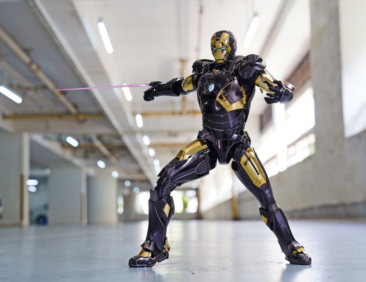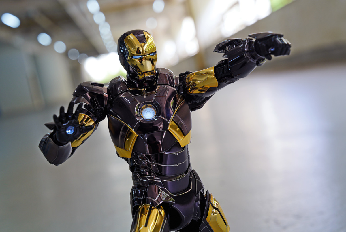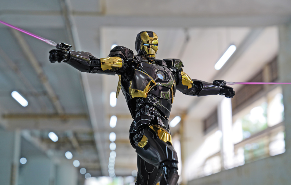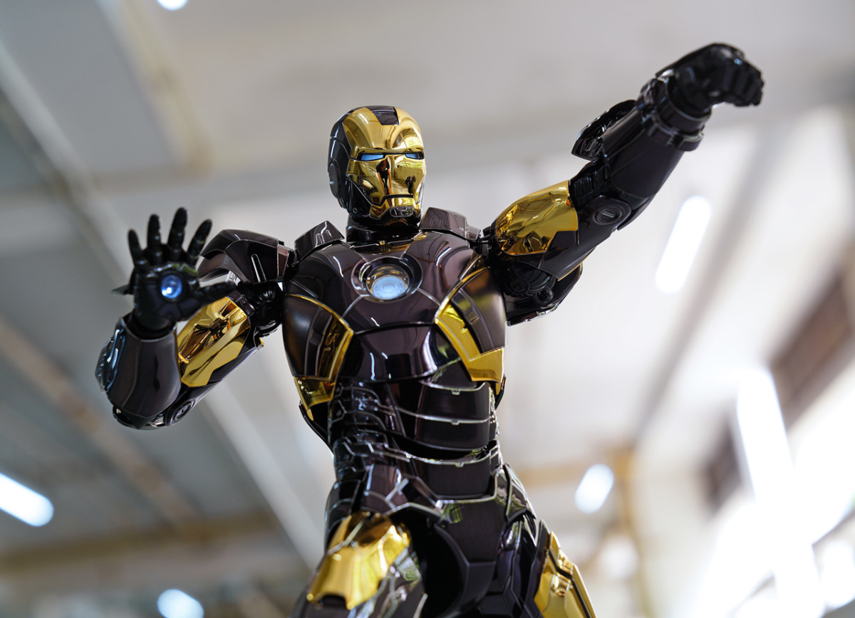 為慶祝漫威85周年的大日子, Hot Toys 推出鐵甲奇俠 Mark VII (黑金電鍍版) 1:6 比例合金珍藏人偶!運用了多層次電鍍上色塗裝技術,於甲件表面鍍上深淺色澤及光啞度不同的鋼鐵黑色和豪華金色,打造出亮鉑金屬色質感的搶眼外觀。同時根據電影 Mark VII 的規格,採用合金素材製作高約 32.5cm、結合流線機械身形比例的裝甲素體。全身多達30個可動關節;於圓形的胸口反應器、雙眼及掌心裝置 LED 亮燈功能可綻放白色光芒,營造極佳視覺效果。