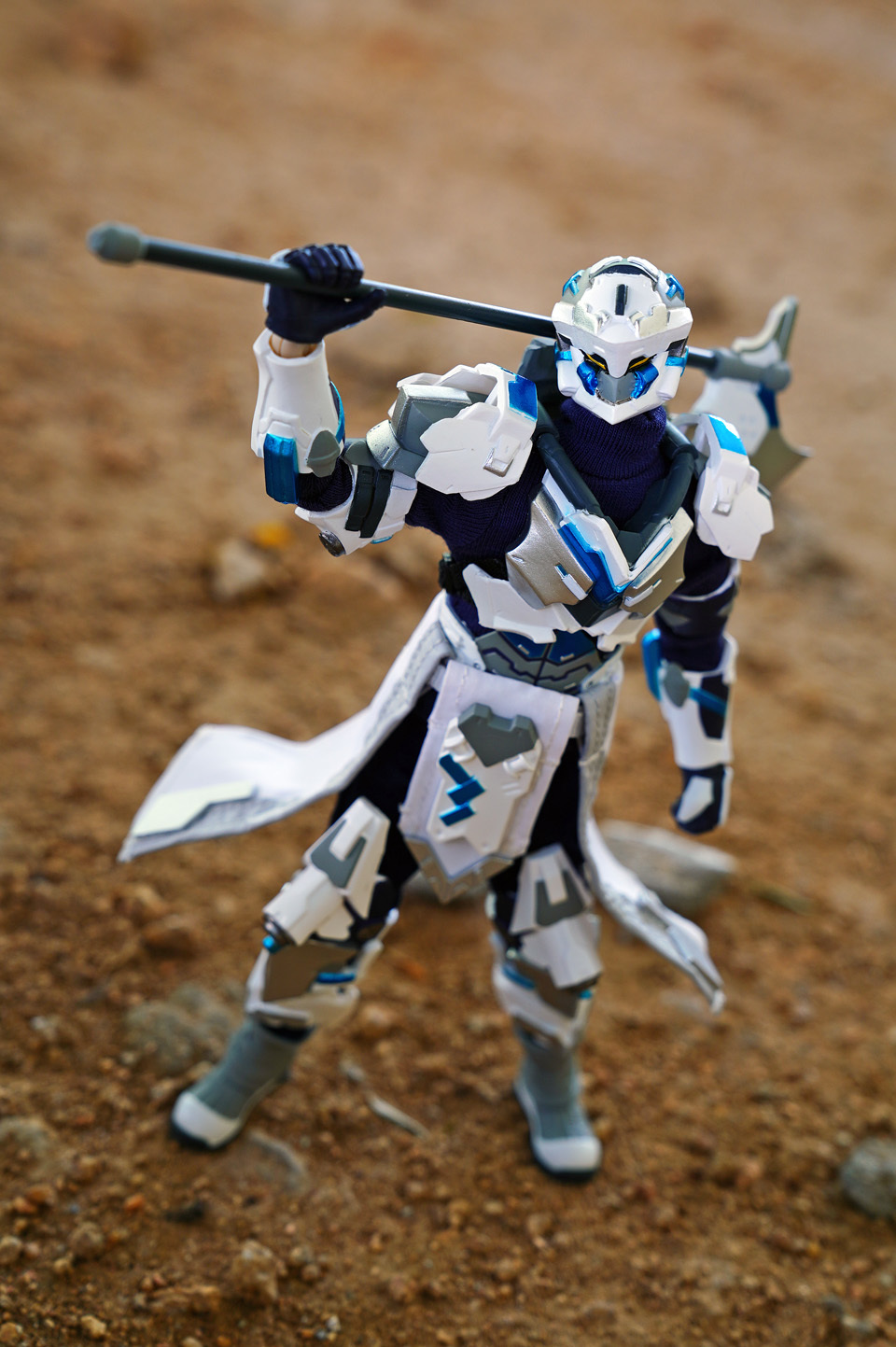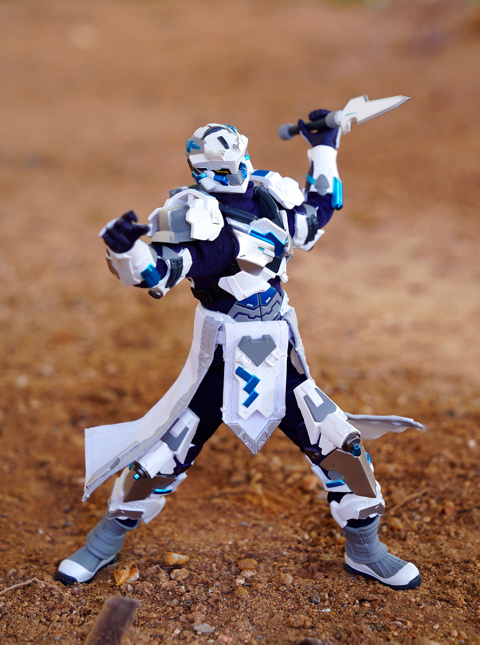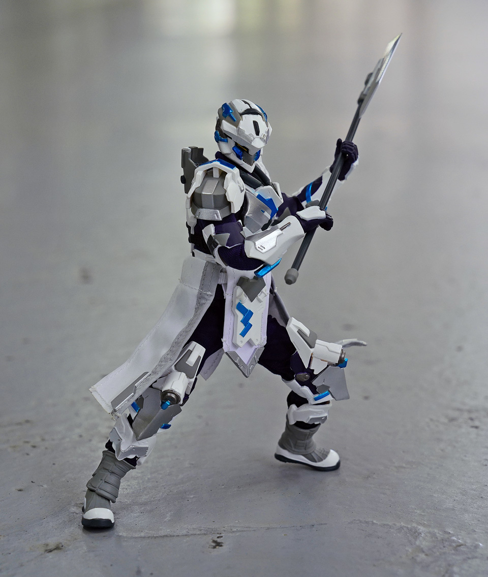 從原來黑灰色的盔甲升級成白銀與金屬籃配搭的全新戰斗形態, 並配上新製作的布製裙甲和兩把長矛。