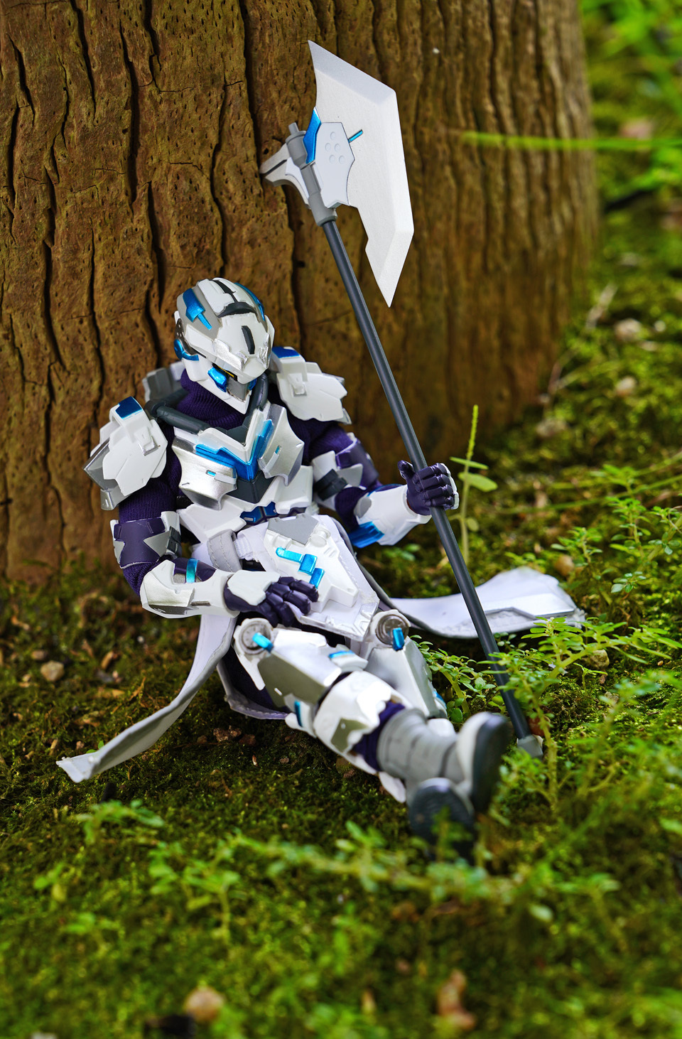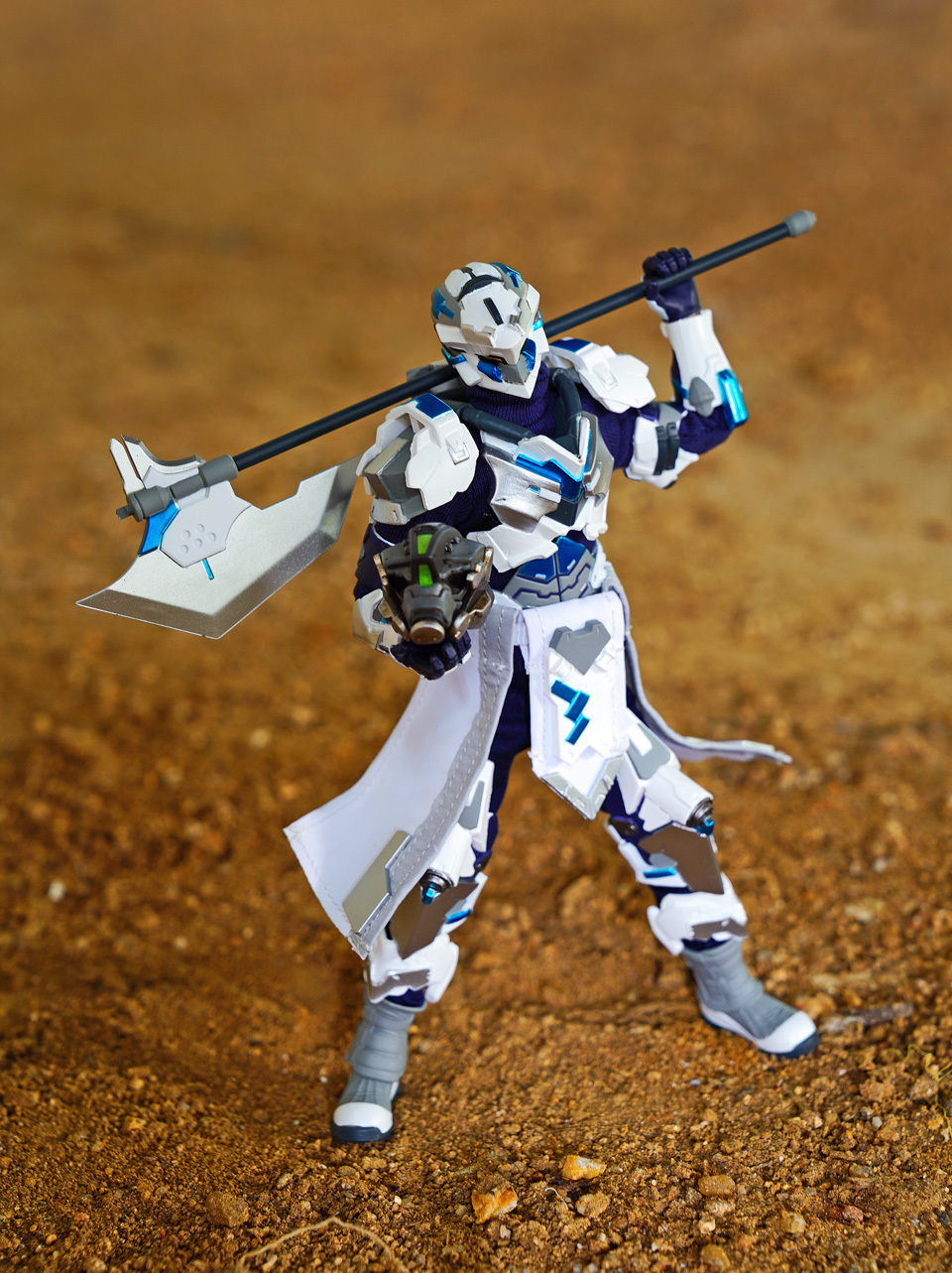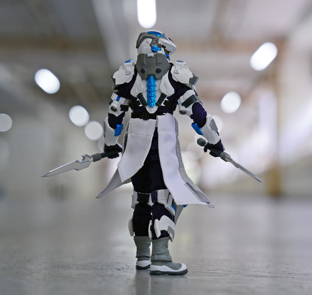 從原來黑灰色的盔甲升級成白銀與金屬籃配搭的全新戰斗形態, 並配上新製作的布製裙甲和兩把長矛。