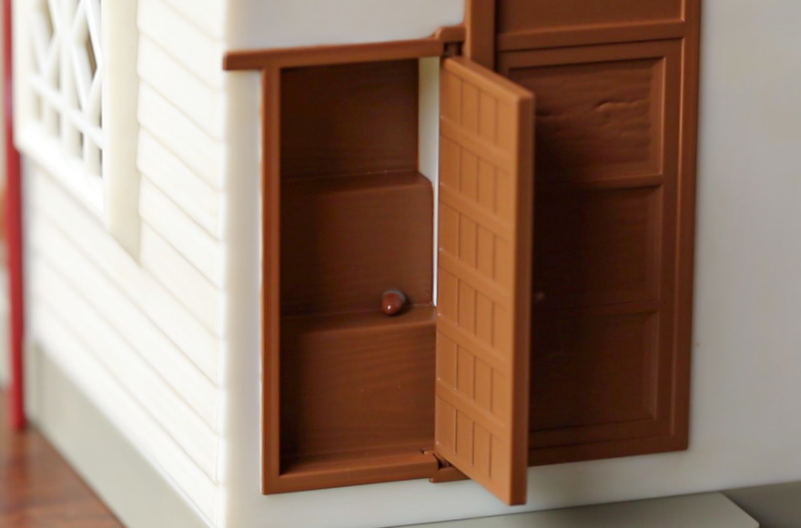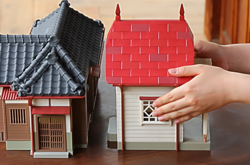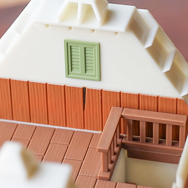 為了表現出房子古色古香的老舊氛圍,特別在屋頂的瓦片、雨水管等處做了變形與退色、損壞的舊化處理,連令人印象深刻、嘎嘎作響的木柱細節都生動還原,腦中馬上浮現小梅與小月在這裡玩耍的景象。