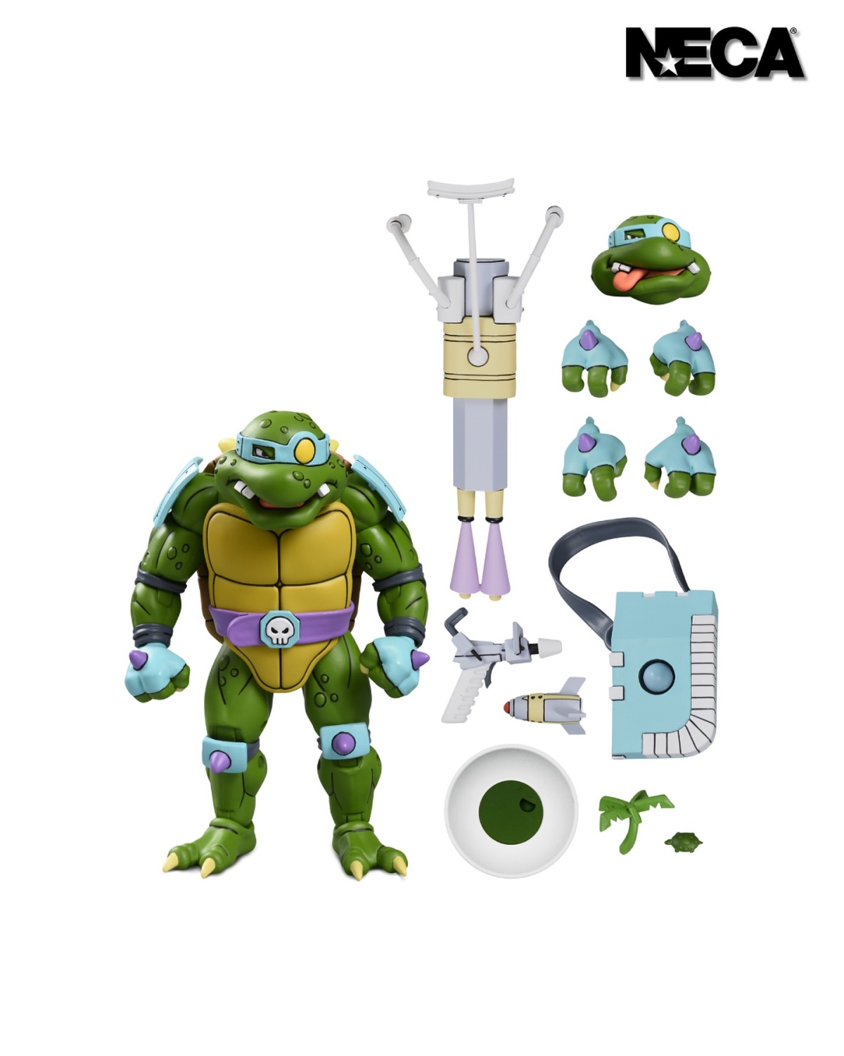 配件部分除兩組替換手以及一顆吐舌頭的替換頭外,絕對少不了史拉許在這世上最喜歡的「Binky」(塑膠棕梠樹),這次是以較硬的塑膠材質製作,並附上了碗狀的底座,重現他初登場時最後在太空船垃圾堆中找到的模樣!武器補齊了先前版本收錄、出自他在第六季第十一集〈多納泰羅痛擊史拉許〉(Donatello Trashes Slash)經過外星人改造變聰明後再度回歸時使用的各種武器,包括手槍型的反地心引力光束槍、在劇中用來封鎖大樓的引力飛彈以及擁有吹出暴風雪能力的冷凍槍,而這次同樣收錄的背包也跟著身體比例一起變大,原本烏龜型態的小史拉許則是縮得更小,讓他對比看起來更魁梧!