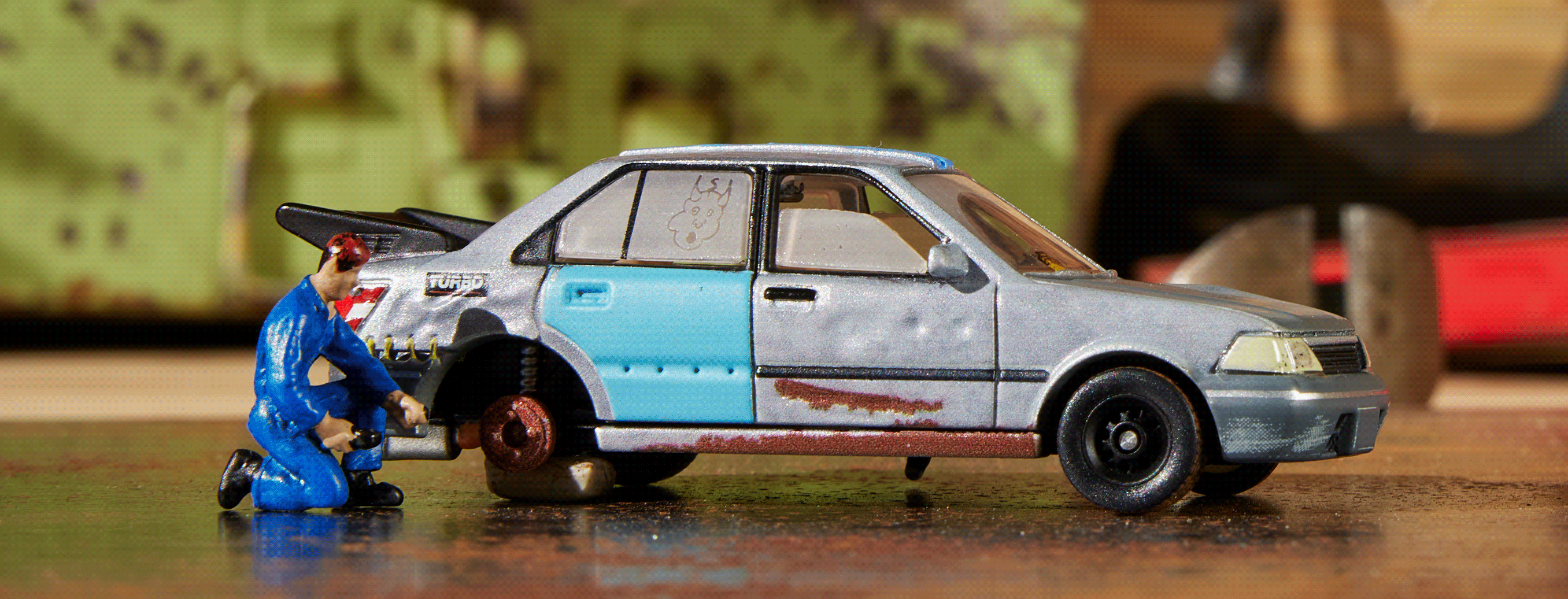 本次的「Not Wheels」名字取自風火輪原文名字 Hot Wheels 的諧音,團隊想要向所有汽車駕駛那輛破舊但可靠的人生第一台車致敬,造型靈感來自 1990 年代初期的日本進口車,打破大眾對於合金汽車模型的印象,製作出了一台看起來破舊到得報廢的小破車!車子配有三種不同的輪胎,分別為兩個風火輪經典的 Real Riders 輪胎、一個黃色備胎,以及一個生銹的輪轂,也因為只有三個輪胎的關係這次的 Not Wheels 是不具備滾動設計的。車身上的生鏽質感、佈滿灰塵的擋風玻璃、刮痕以及粗暴的修補痕跡都經過手工細緻還原,只改了尾翼的空力套件和 Fart Can 的設計也充滿了對屁孩廉價改車的諷刺,車尾更貼有「Born To Drive, Life is a Truck」和「I am Hot Wheel」等車子雙關笑話的保險桿貼紙,真的是細節滿滿!
