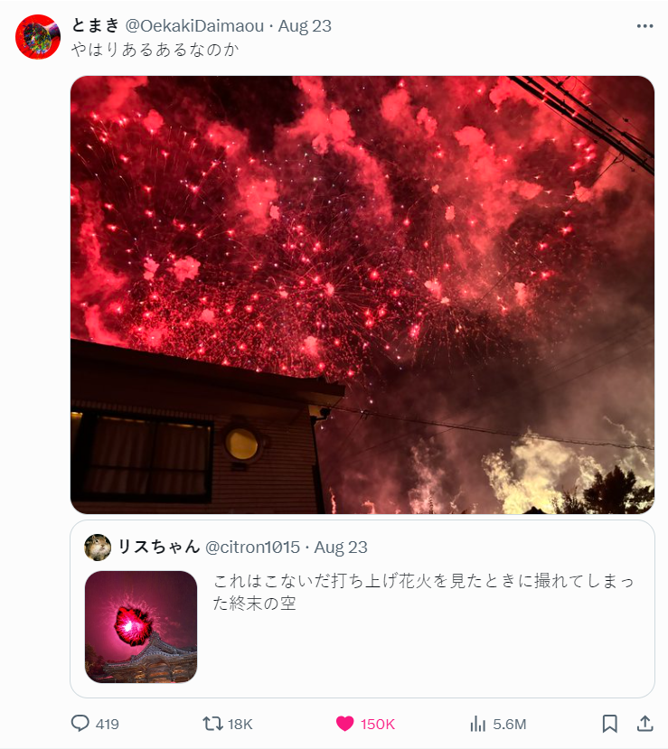 不過在日本 X 上,有位推主分享了自己拍攝煙火的瞬間,卻拍出了一張「不該出現場景」,彷彿像是遊戲裡蟲洞出現的瞬間,搭配血紅色的天空,這驚人景象瞬間引起網民熱議,好奇到底怎麼拍出來的。