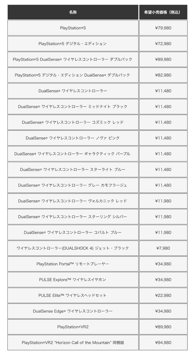 根據目前 PS5 官網公布的情況,像是主機、DUALSHOCK、DualSense® 、PlayStation Portal™、PlayStation®VR2等相關周邊全部都一應調漲,像是主機價格就從 66,980 日圓上漲到 79,980 日圓,調漲程度約 2 成。