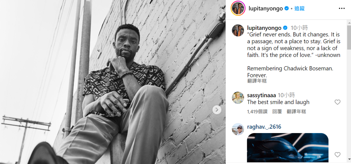在《黑豹》電影系列飾演「娜奇亞」的露琵塔·尼詠歐 (Lupita Nyong'o)在 IG 引述一段佚名語錄:「悲痛永遠不會止息,但它能帶來改變。它不是個駐足不前的地點,而是另一條道路。悲痛不是軟弱的象徵、亦不是迷失的信念。悲痛是愛的代價。永遠懷念 查德維克鮑斯曼。」