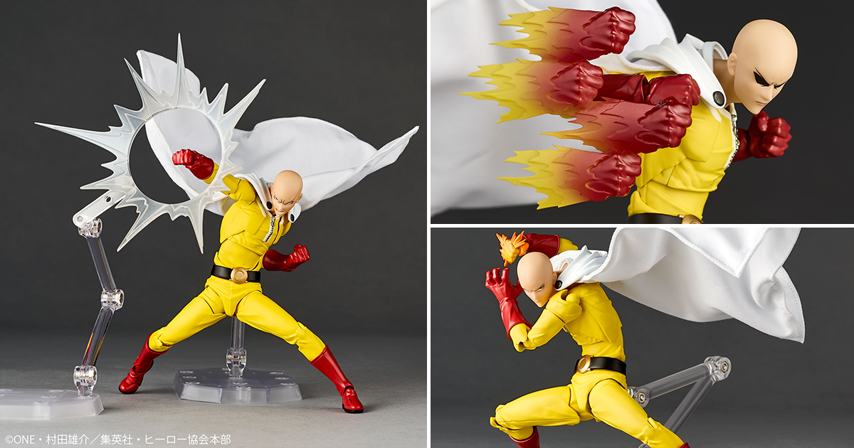 本作高約 15. 公分,以山口勝久老師極具特色的關節設計&軀體分割技術重新詮釋埼玉那套紅黃配色的英雄戰鬥服,並形塑出生動的肌肉線條,由 Kazu 採布料縫製的白色披風更內置鐵線,加以彎折之後便能大幅增加埼玉戰鬥姿態的躍動張力!頭雕一共有六顆,包含三種視線狀態的認真臉(マジ顔)、三種喊叫臉(叫び顔),配件包含讓你重現認真毆打(マジ殴り)的衝擊波特效兩種與施以橘紅色塗裝的蓄力拳頭、聽起來超廢但如果由埼玉施展就擁有超凡威力的連續普通拳(連続普通のパンチ),以及多個替換手。