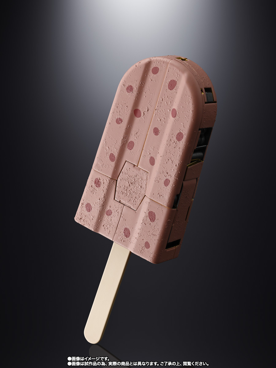 由日本井村屋推出的紅豆冰棒不僅便宜好吃、成分純粹,更擁有讓人超乎想像的超級硬度!本次超合金與井村屋可說是硬上加硬的暴力聯名作「紅豆冰棒機器人」絕對是值得收藏的夢幻逸品。比照紅豆冰棒實品所打造的 1:1 比例紅豆冰棒機器人重約 240 克,合金佔比高達 95%,在冰棒模式下充分展現了井村屋紅豆冰棒的表面紋理與代表著紅豆的圖案,搭配超合金的特製底座展示可說是尊絕不凡!絕對不會融化。