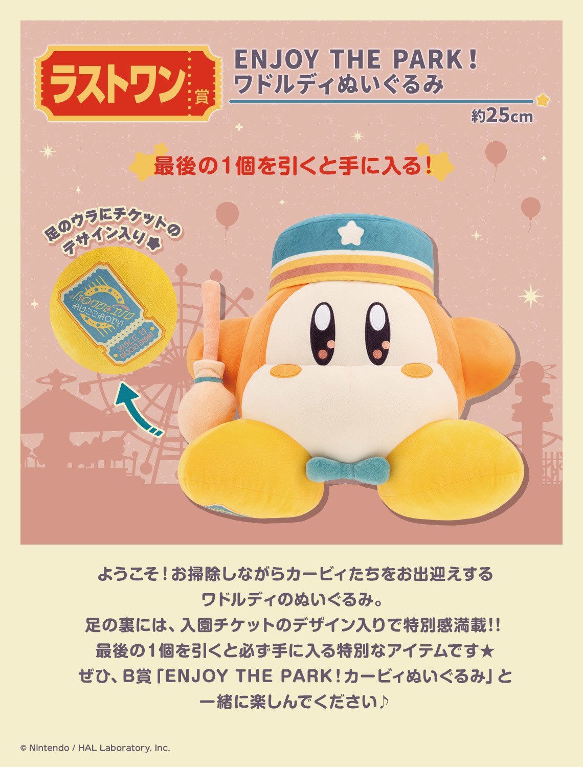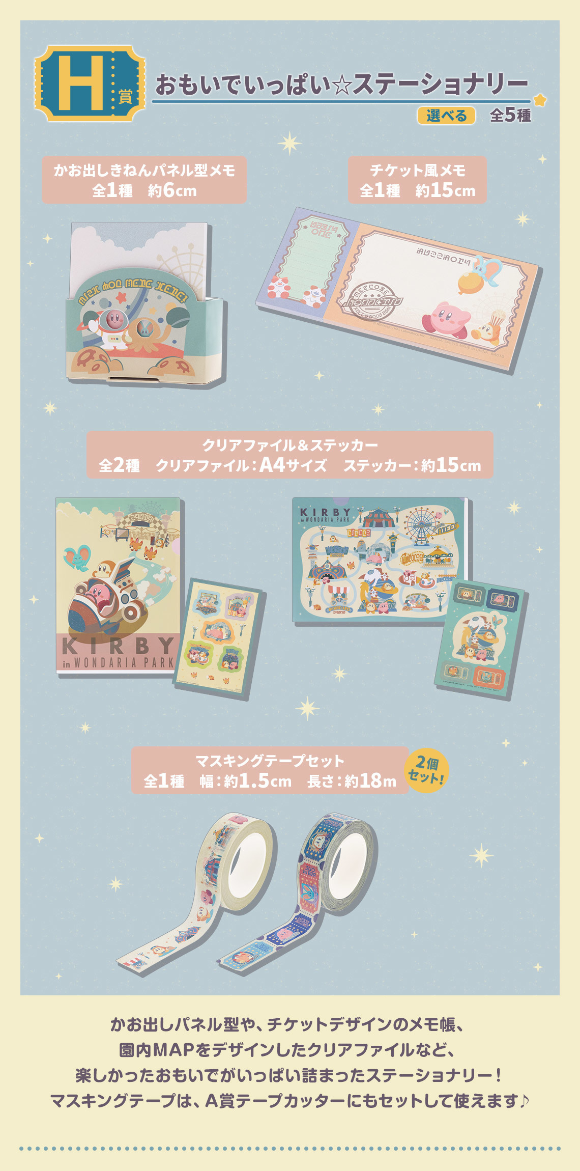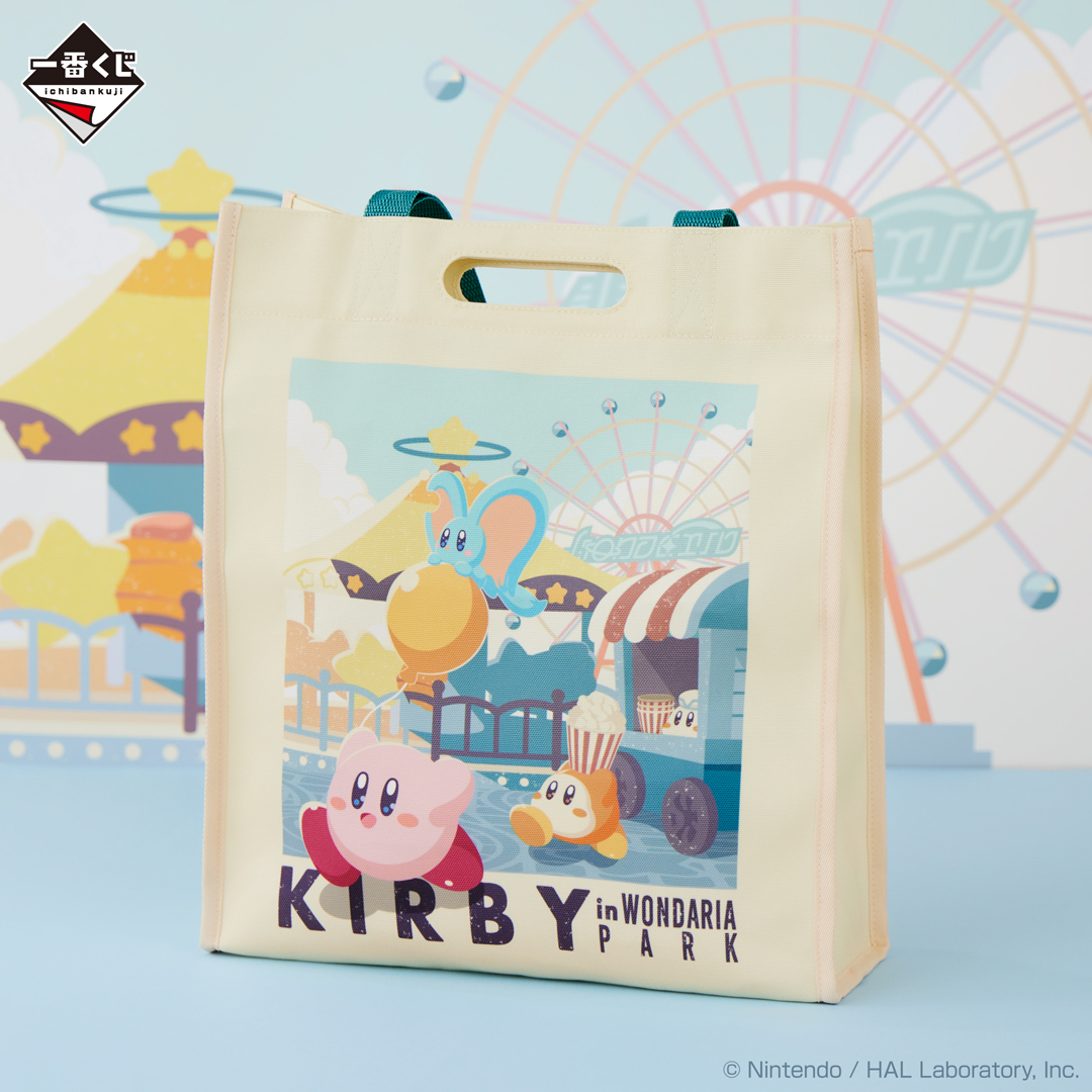 本次的「星之卡比 WELCOME TO THE NEW PARK!」以 2022 年作品《星之卡比 探索發現》中的關卡「歡迎光臨驚奇樂園」為主題,提供 A~H、最後一賞與雙重中獎賞等不同級別的賞品。其中 A 賞及雙重中獎賞為「旋轉摩天輪☆膠帶切割機」,至做了卡比與瓦豆魯迪在摩天輪造型的膠帶切割機旁追逐奔跑的模樣,可以用來切割一般尺寸的膠帶與紙膠帶,既可愛又實用!B 賞為高約 25 公分的卡比大型絨毛娃娃,右腳底上印有樂園門票的圖樣,製作了他拿著爆米花的模樣,可以成為各位玩具人看劇的好夥伴!