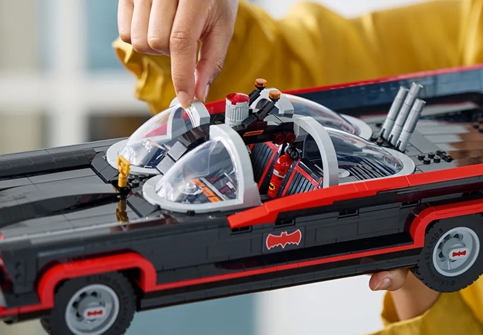 本作除了 1966 年電視劇中的經典蝙蝠車之外,還有附上一個 1966 年造型、亞當·韋斯特(Adam West)版本的蝙蝠俠樂高人偶,經過細緻印刷的蝙蝠裝相當令人懷念,不只有製作出一個底座,更追加了 1966 年蝙蝠俠電視劇主題的蝙蝠車名牌可以一起展示。