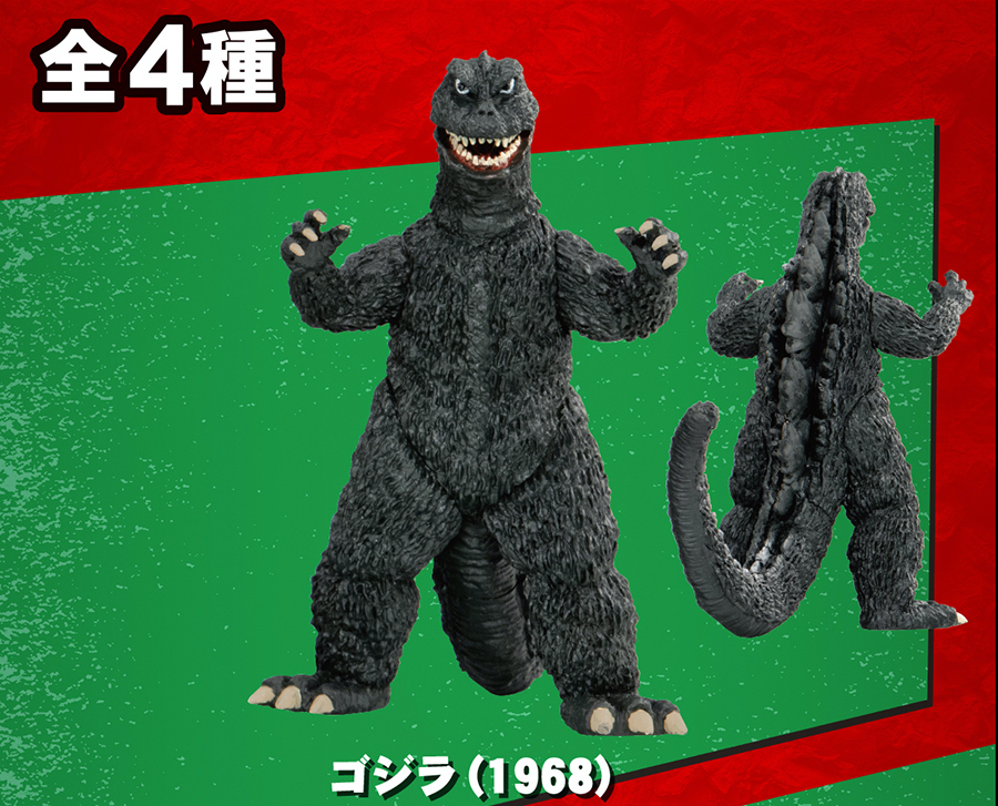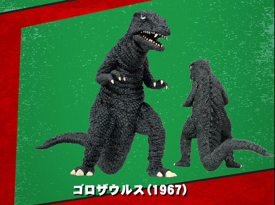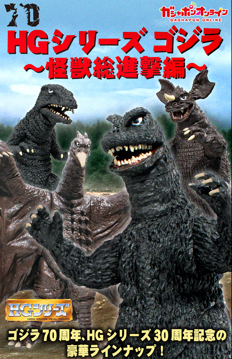 本次的「HG 系列~怪獸總進擊編~模型」轉蛋為慶祝哥吉拉 70 週年,以 1968 年《怪獸總進擊》中登場的怪獸為名題,推出幾個人氣怪獸在昭和時代的人氣造型!以 《怪獸總進擊》中的哥吉拉為首,收錄了 1964 年《三大怪獸 地球最大決戰》 中登場的拉頓、1967 年《金剛的逆襲》中首次的哥羅龍以及 1965 年《科學怪人對地底怪獸》首次登場的巴拉剛,還原角色們經典的皮衣造型,一字排開散發出滿滿的昭和味!
