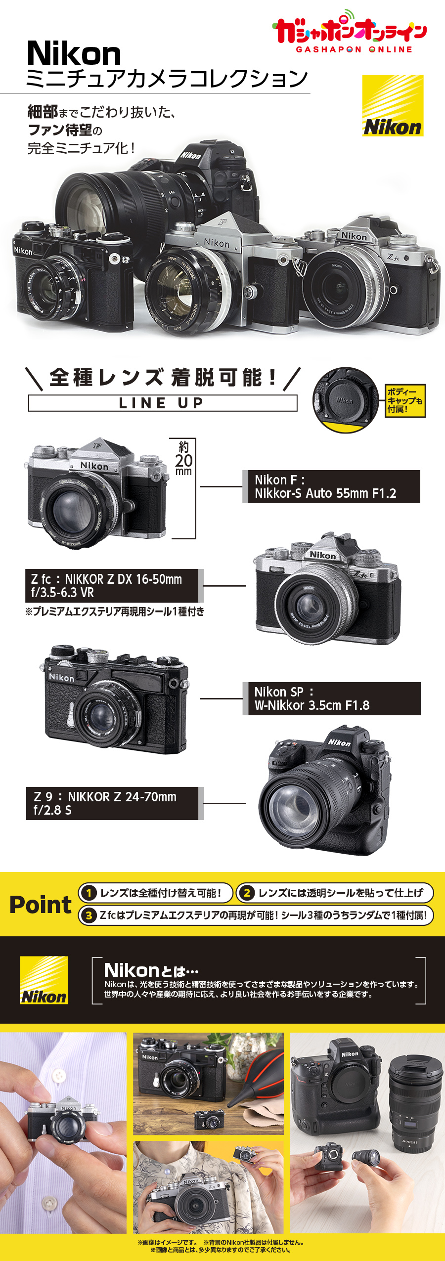 GASHAPON 本次推出的「Nikon 迷你相機收藏」轉蛋,將首款單眼相機Nikon F : Nikkor-S Auto 55mm F1.2、Z fc : NIKKOR Z DX 16-50mm f/3.5-6.3 VR、Nikon SP : W-Nikkor 3.5cm F1.8、Z 9 : NIKKOR Z 24-70mm f/2.8 S四款 Nikon 相機話微微縮模型,在約 20 mm 的小尺寸徹底還原機體與鏡頭的造型,精密的細節也相當注重!所有的鏡頭都可以拆卸替換,還附有鏡頭蓋,跟相機實體放在一起比較超級可愛!