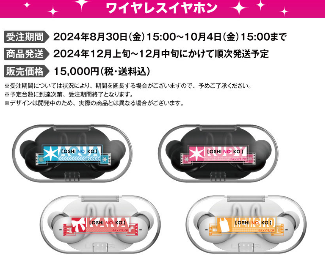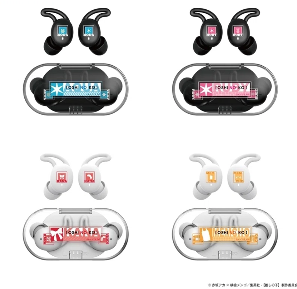 推出包含 : 阿奎亞/星野愛久愛海、露比/星野瑠美衣、有馬加奈與 MEM CYO四位,設計上專屬充電收納盒 & 耳機本體採用黑色設計,搭配角色的對應色系與作品名稱,耳機上也有角色英文名。