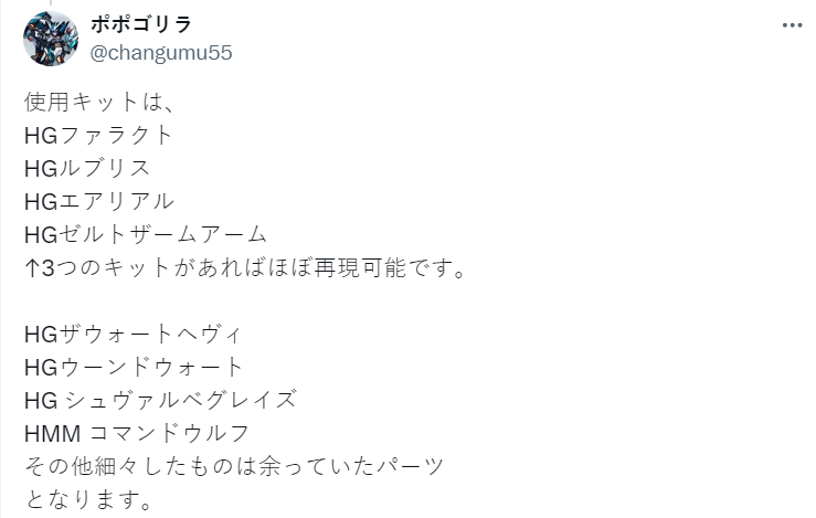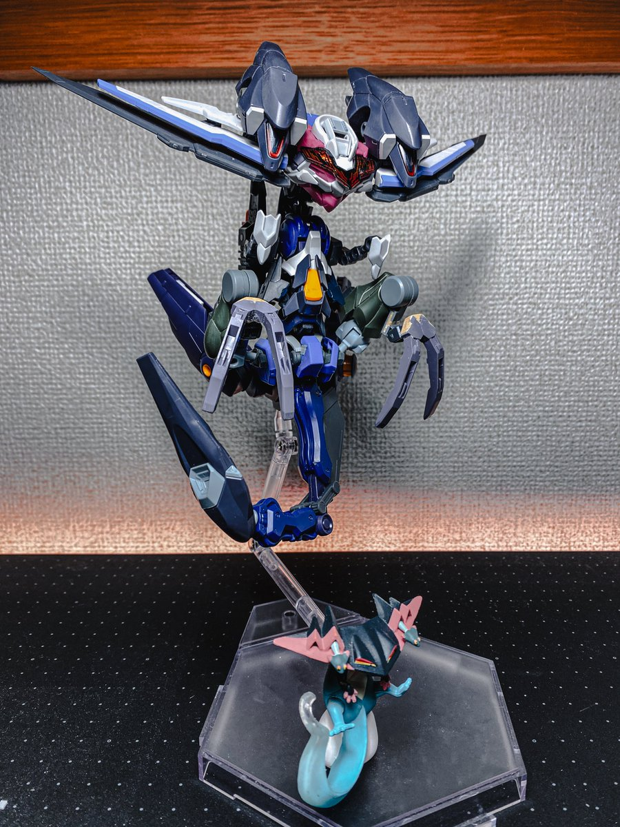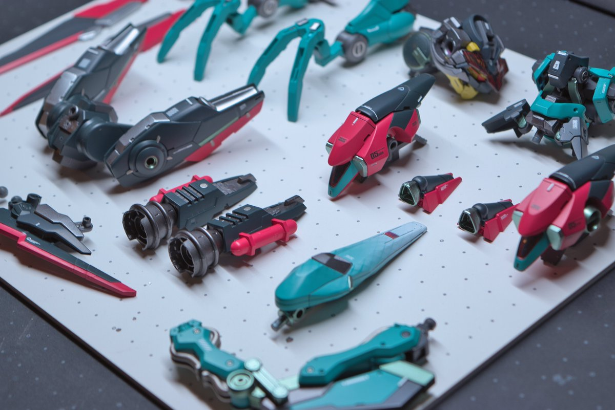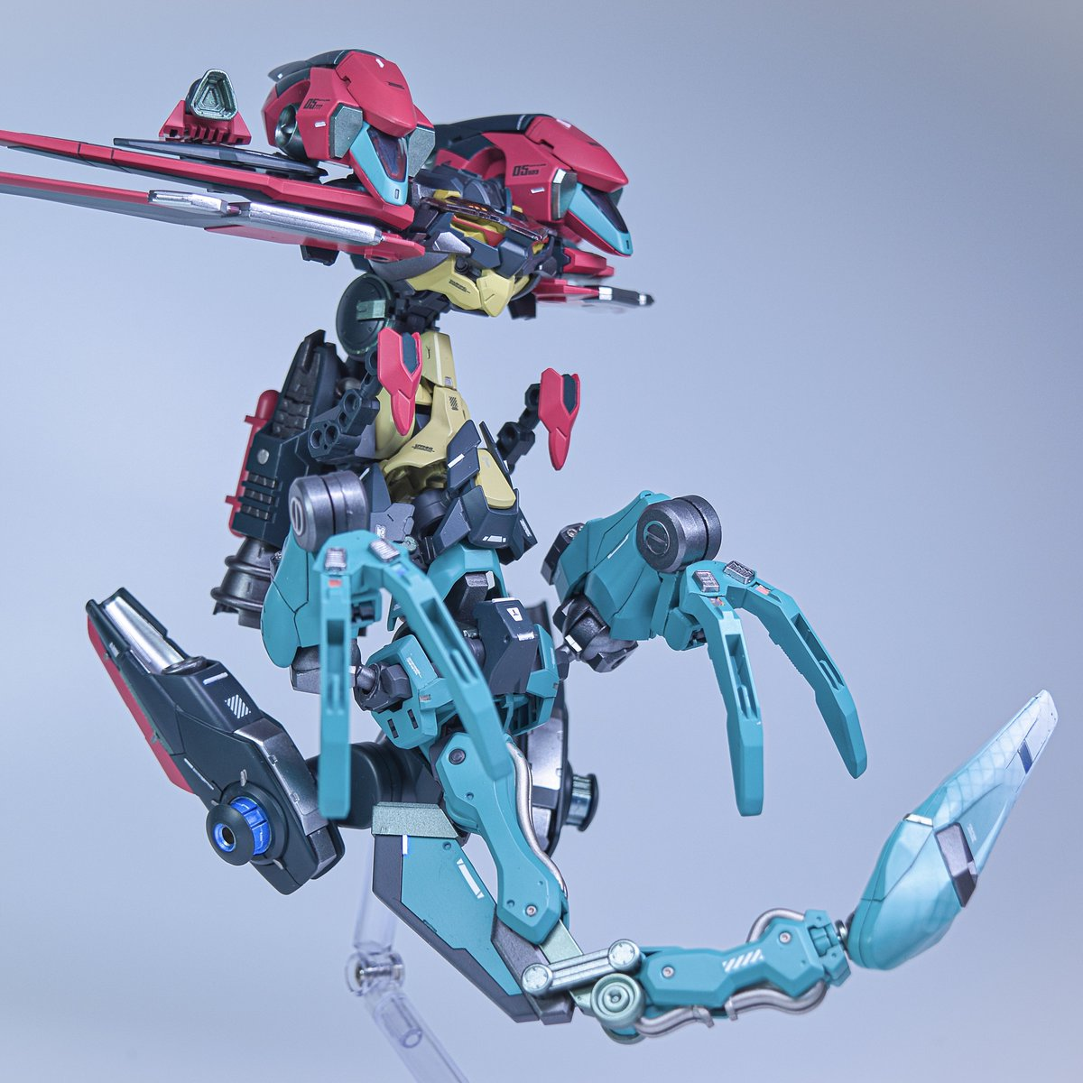 他所選用的料件主要包含 : 鐵騎鋼彈、魔靈剛彈、風靈鋼彈、奇異鋼彈,這四個選三個基本上就可以製作個大概,剩下組件還有包含 : 重裝型佐渥特、伍德沃特、燕式格雷茲、ZOIDS 的 HMM 機動奔狼,擷取各部零件組裝而成。