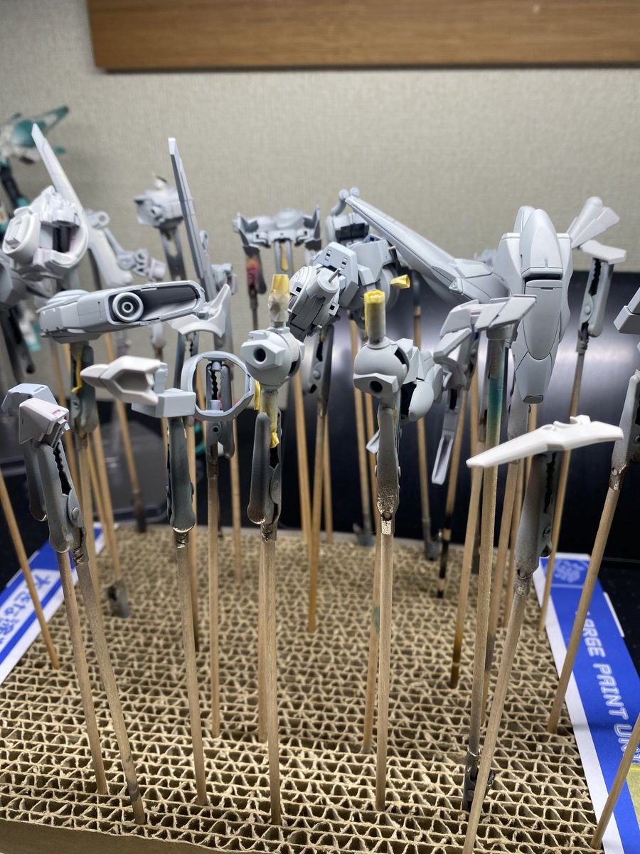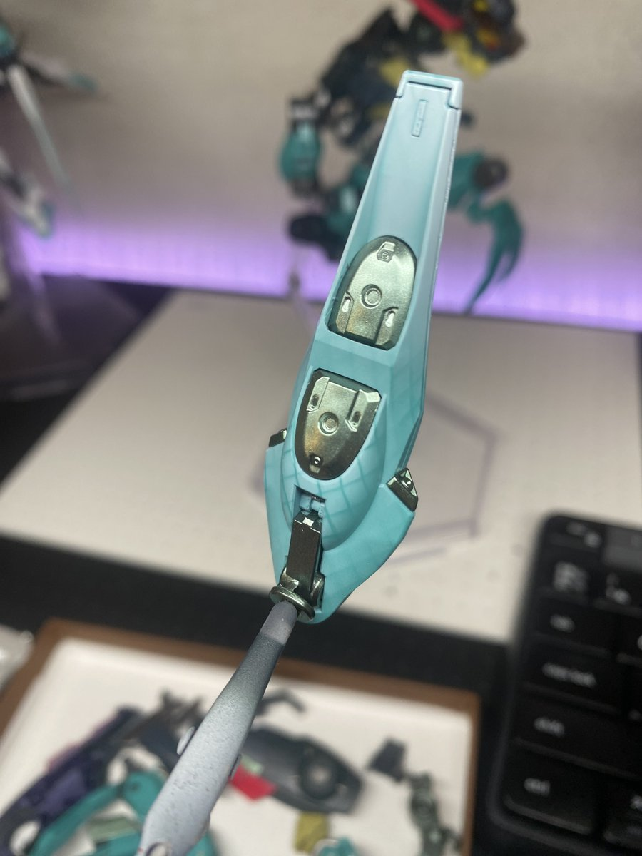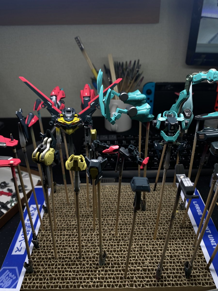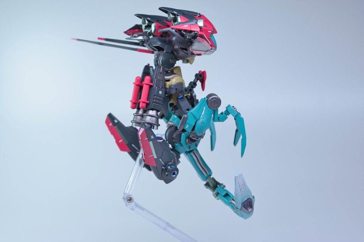 他所選用的料件主要包含 : 鐵騎鋼彈、魔靈剛彈、風靈鋼彈、奇異鋼彈,這四個選三個基本上就可以製作個大概,剩下組件還有包含 : 重裝型佐渥特、伍德沃特、燕式格雷茲、ZOIDS 的 HMM 機動奔狼,擷取各部零件組裝而成。