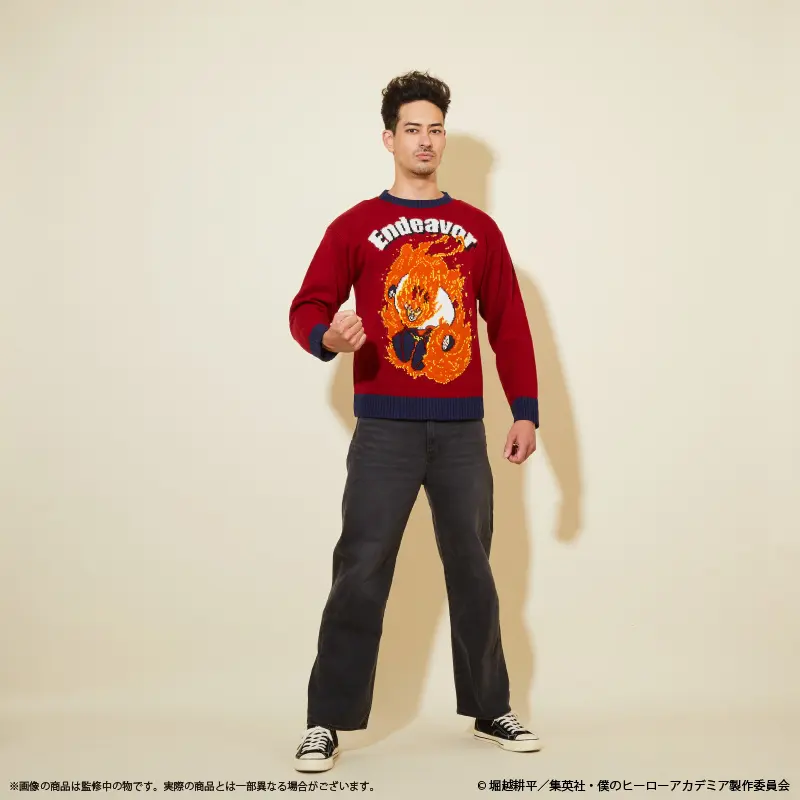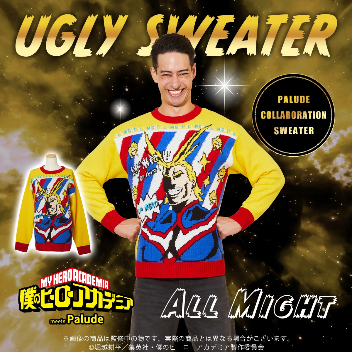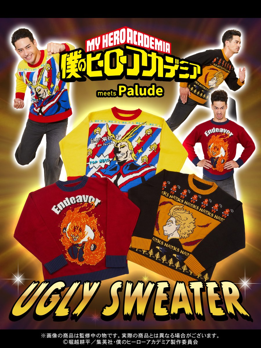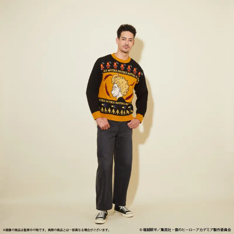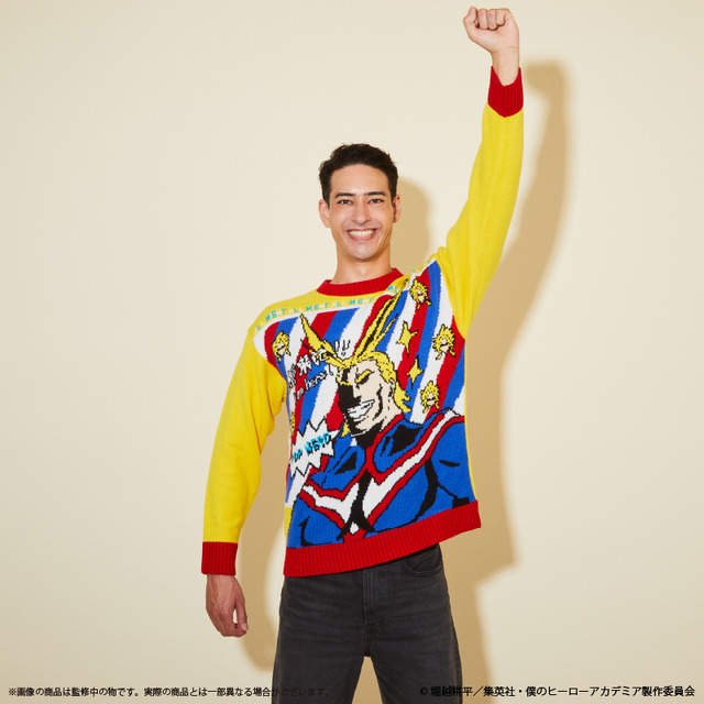 這次使用的圖案延續醜毛衣該有的滿版設計,以《我的英雄學院》三位戰力堅強的職業英雄 : 歐爾麥特、奮進人與霍克斯來設計,人物大頭大方的放在衣服上讓你穿出眾人矚目的風格,相信各位也是...可以穿得很有型吧 XD。
