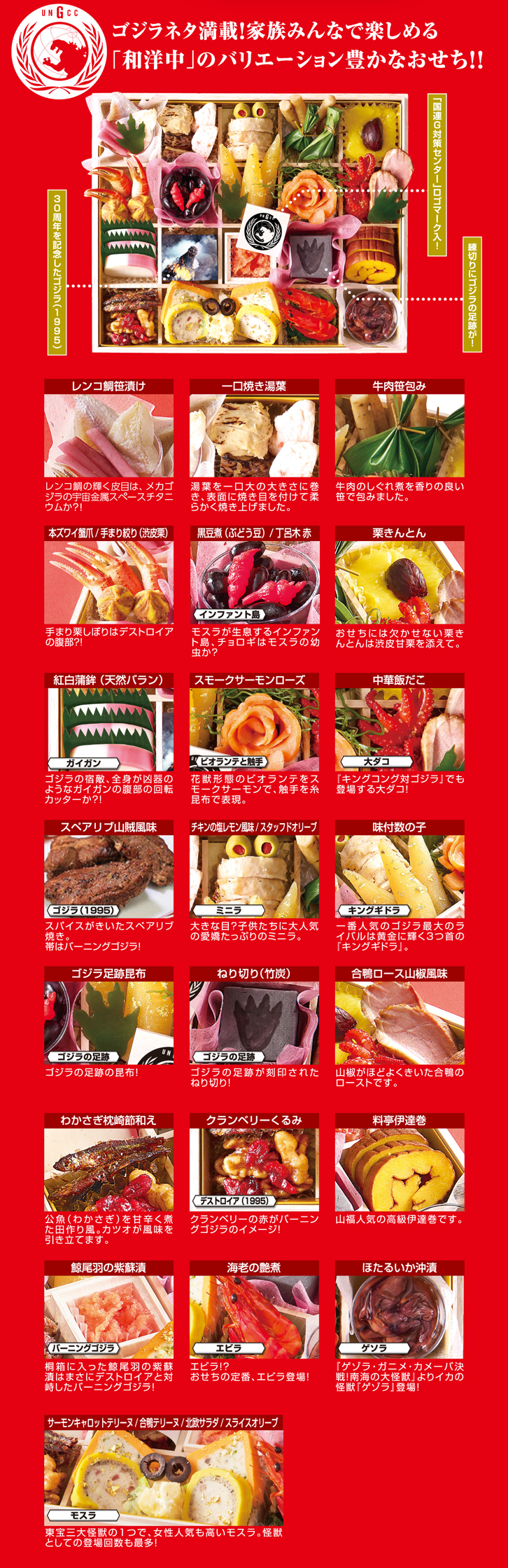 料理部分也毫不馬虎,採用多種美味的海鮮與年菜餐點,並呼應怪獸名作裡面出現的怪獸角色,絕對是各位怪獸粉的最適合的年菜料理。