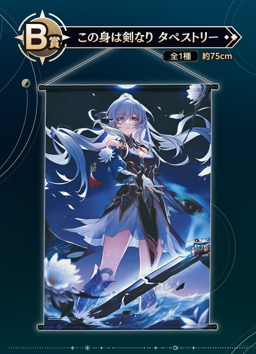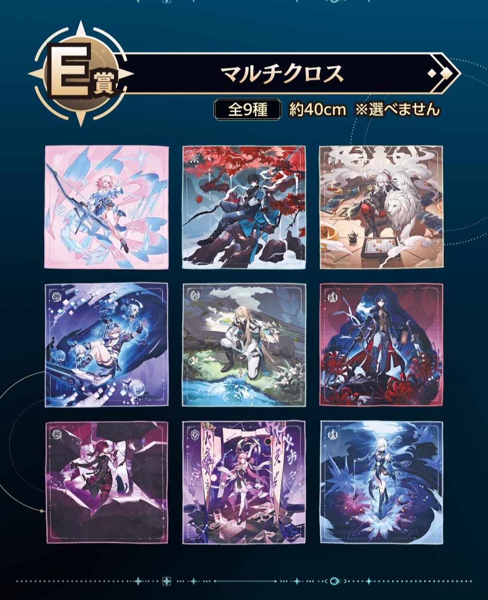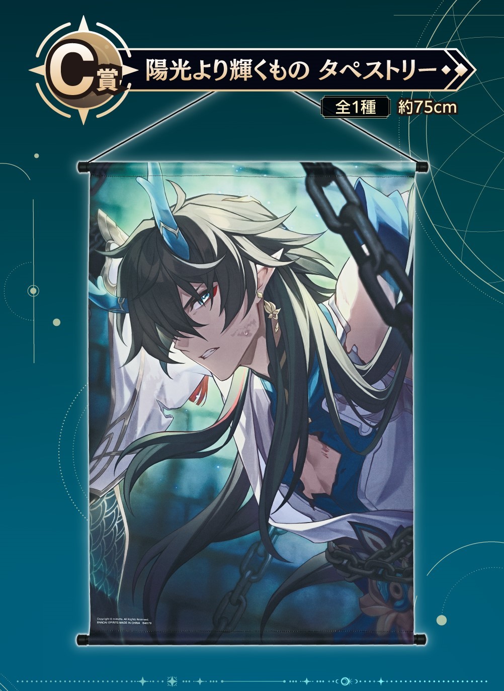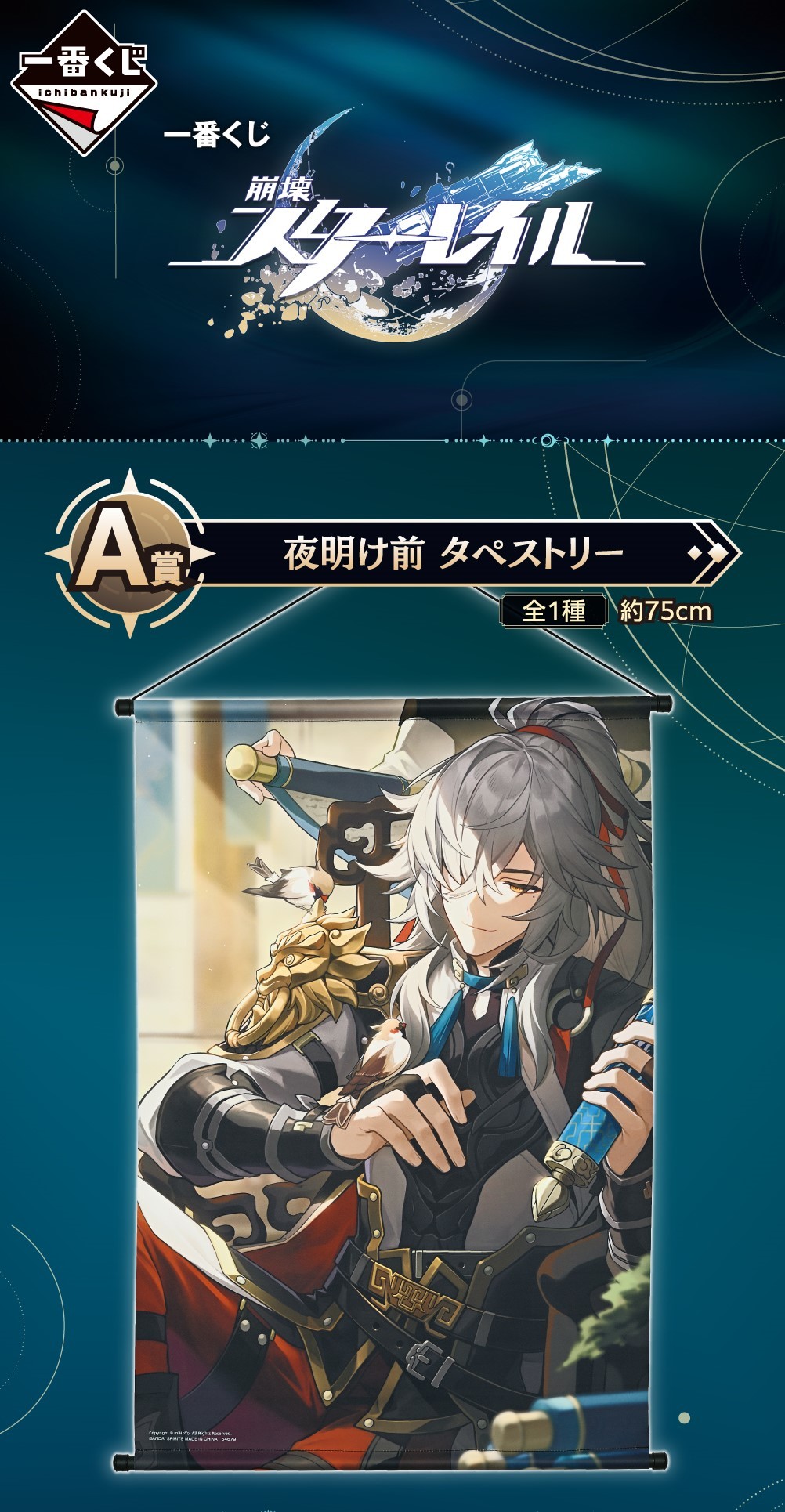 「一番賞 崩壞:星穹鐵道」,帶來 A賞 ~ G賞 +最後賞等豐富的獎品,包含有:75 公分的 A賞 景元光錐「拂曉之前 掛布」、B 賞鏡流「此身為劍 掛布」及 C 賞飲月「比陽光更明亮 掛布」,精美的插畫印製在大褂布,氣勢十足!另外還有超讚讚的 D 賞的「垃圾桶造型馬克杯」,以及掛布、壓克力吊飾、橡膠杯墊等週邊商品,最後賞更是三張一組的插畫板套組!