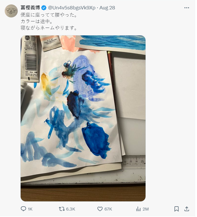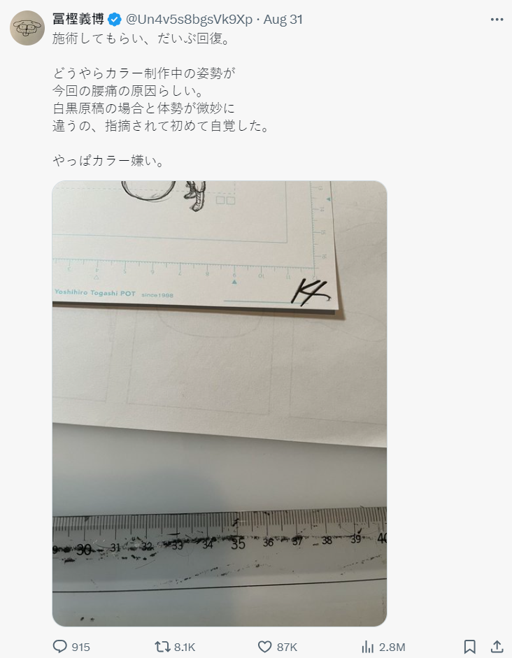 發文的前幾天,冨樫貼出自己在畫彩稿的途中,連上廁所坐在馬桶上腰都在痛,真的看得出來這問題讓他非常困擾。