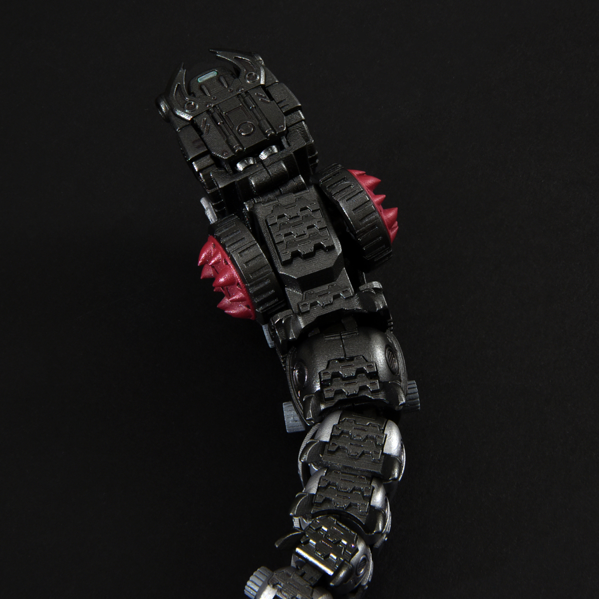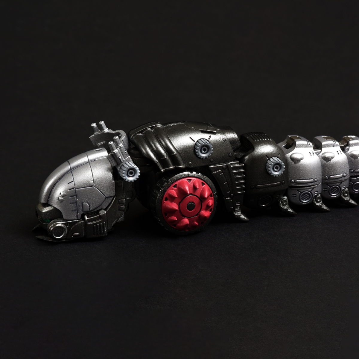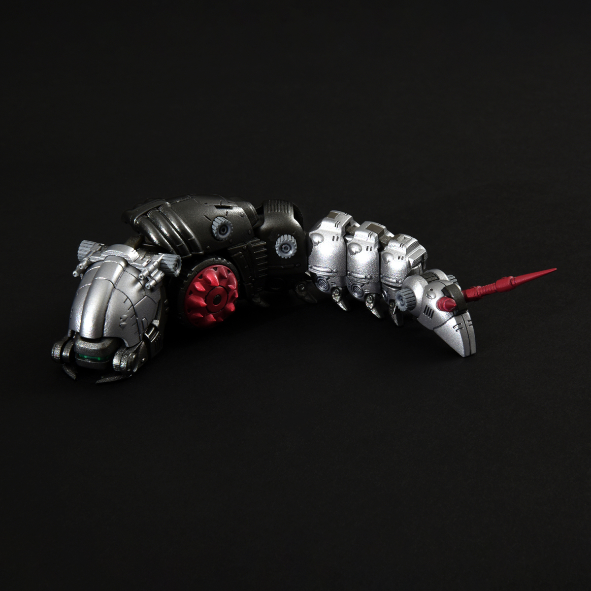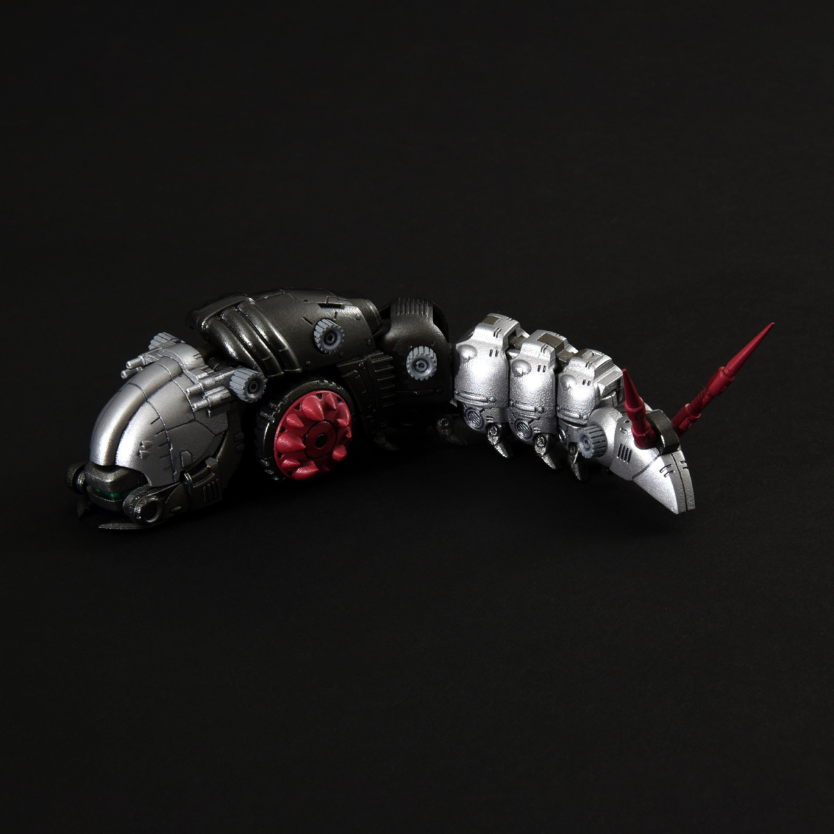 全身多節身軀內藏拉出式關節,能如同現實中的毛蟲般將身軀朝多方向扭動,前後、左右都能大幅彎曲成 U 字形。腹部兩側的巨輪搭載了可左右轉動的骨架,輪胎基部則使用球形連接零件,可作出更細微的輪胎動作。