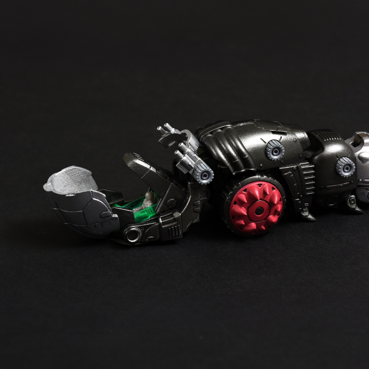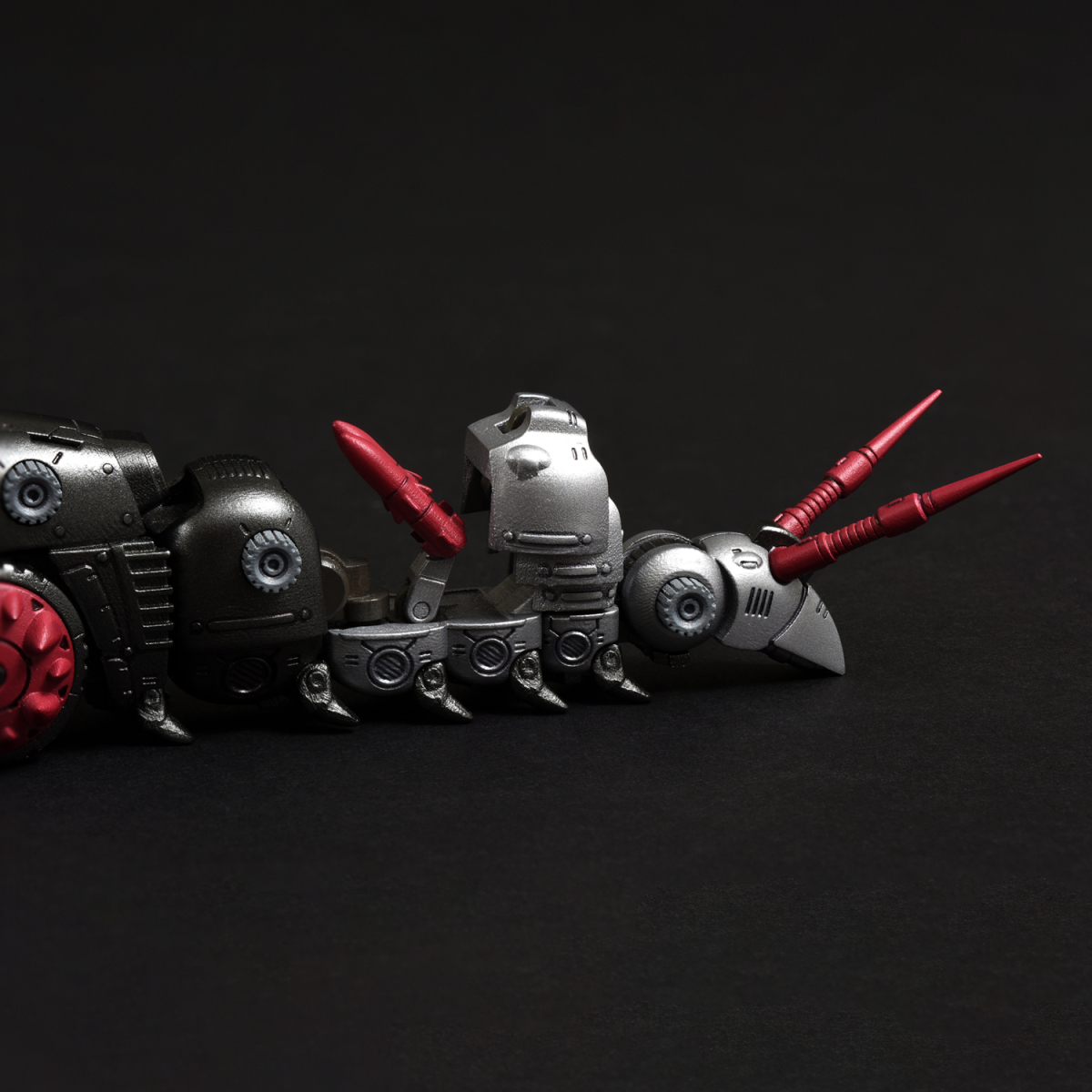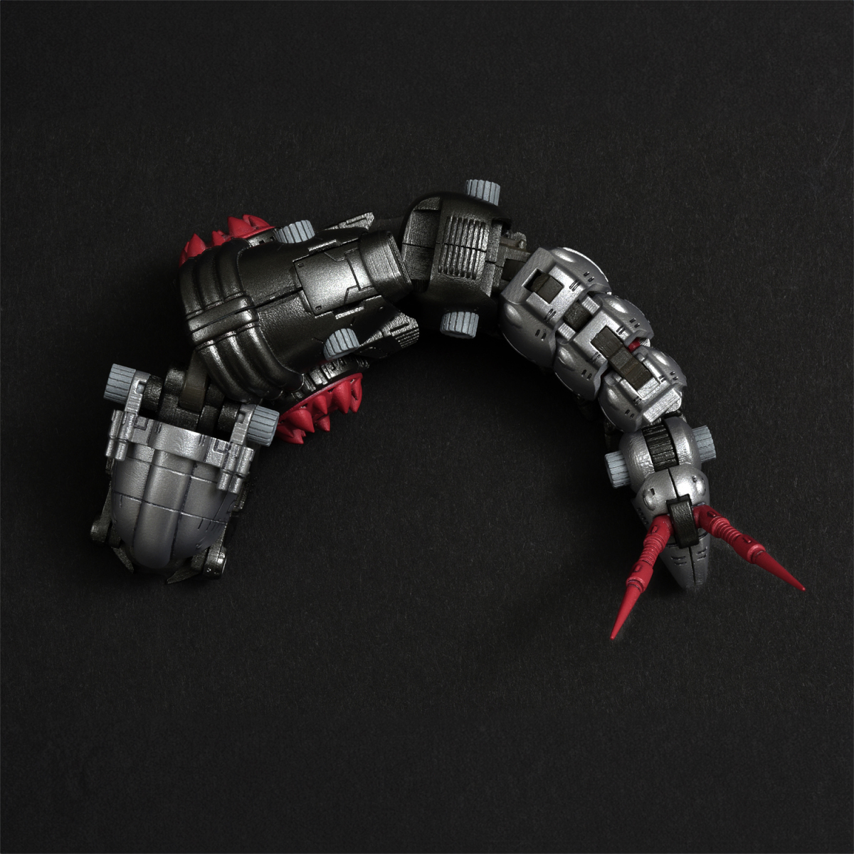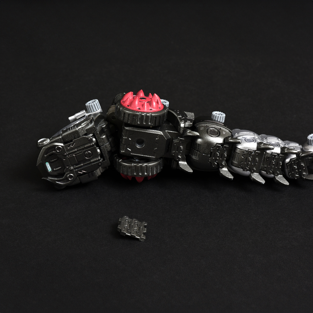 全身多節身軀內藏拉出式關節,能如同現實中的毛蟲般將身軀朝多方向扭動,前後、左右都能大幅彎曲成 U 字形。腹部兩側的巨輪搭載了可左右轉動的骨架,輪胎基部則使用球形連接零件,可作出更細微的輪胎動作。