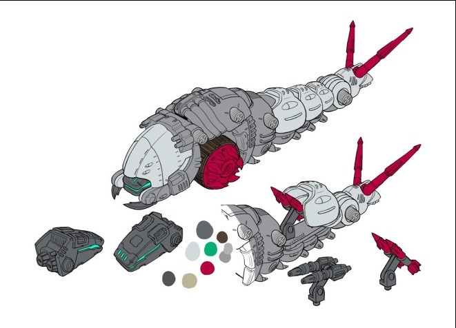 「RMZ-005 重裝天蠶 凱伊洛斯配色」運用現代技術重新構築如同毛蟲外觀的分節身軀、腹部特徵的動輪構造,尾部內藏的飛彈也為了追求更加真實的機械感,採用新設計的艙蓋開閉機構。細節密度比起過去昭和、平成時期販售的電動版本更為提升。