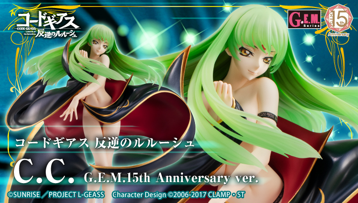 「C.C. G.E.M.15th Anniversary ver.」基於過去運用在各類週邊商品的話題版權插畫製作,以全高約 22 公分尺寸呈現 C.C. 裸身披著 ZERO 披風的性感姿態。透過躍動的造型表現出長髮、披風飄揚的模樣,頭髮零件更以透明材質施以塗裝,表現髮絲的輕盈與透光感。