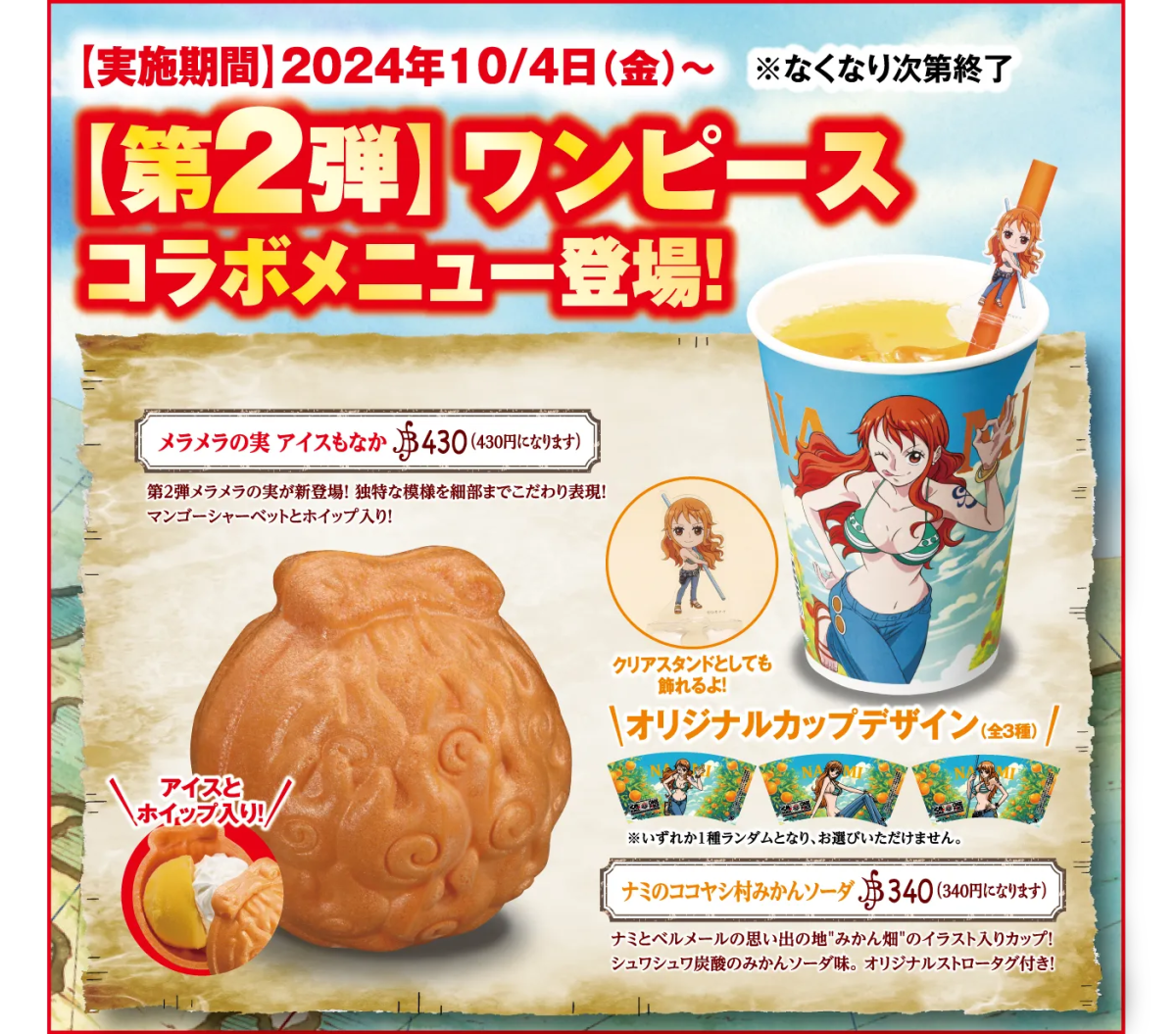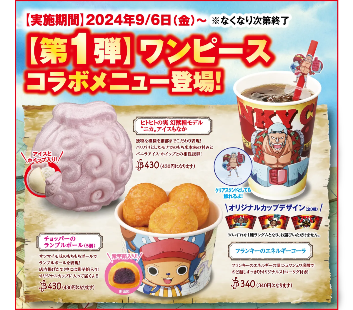包含 : 魯夫的人人果實尼卡型態造型的最中餅冰淇淋、喬巴的藍波球造型地瓜球、佛朗基的能量可樂飲料;也預告 10 月第二彈將有燒燒果實最中餅冰淇淋與娜美的可可亞西村柑橘蘇打飲料。