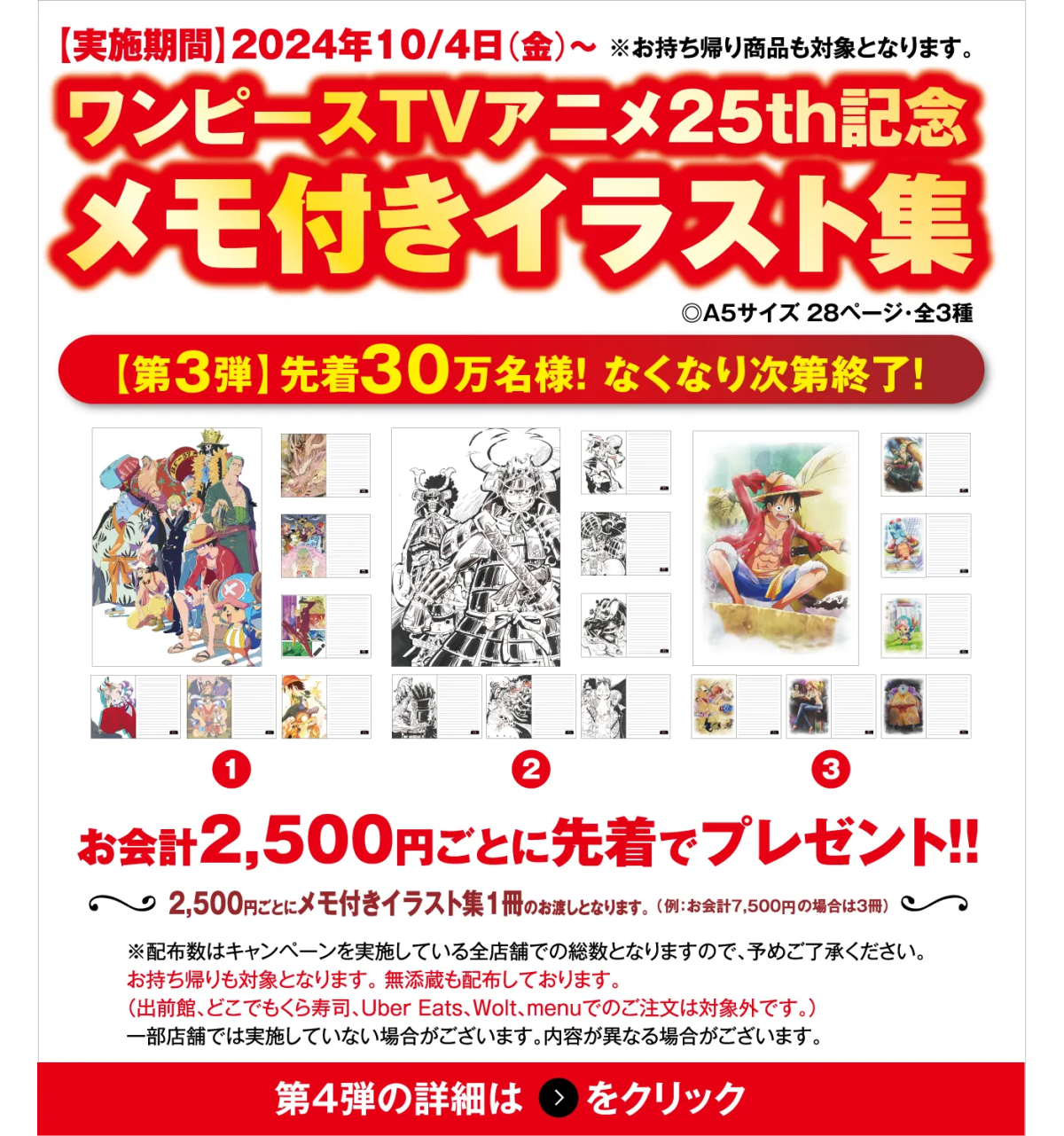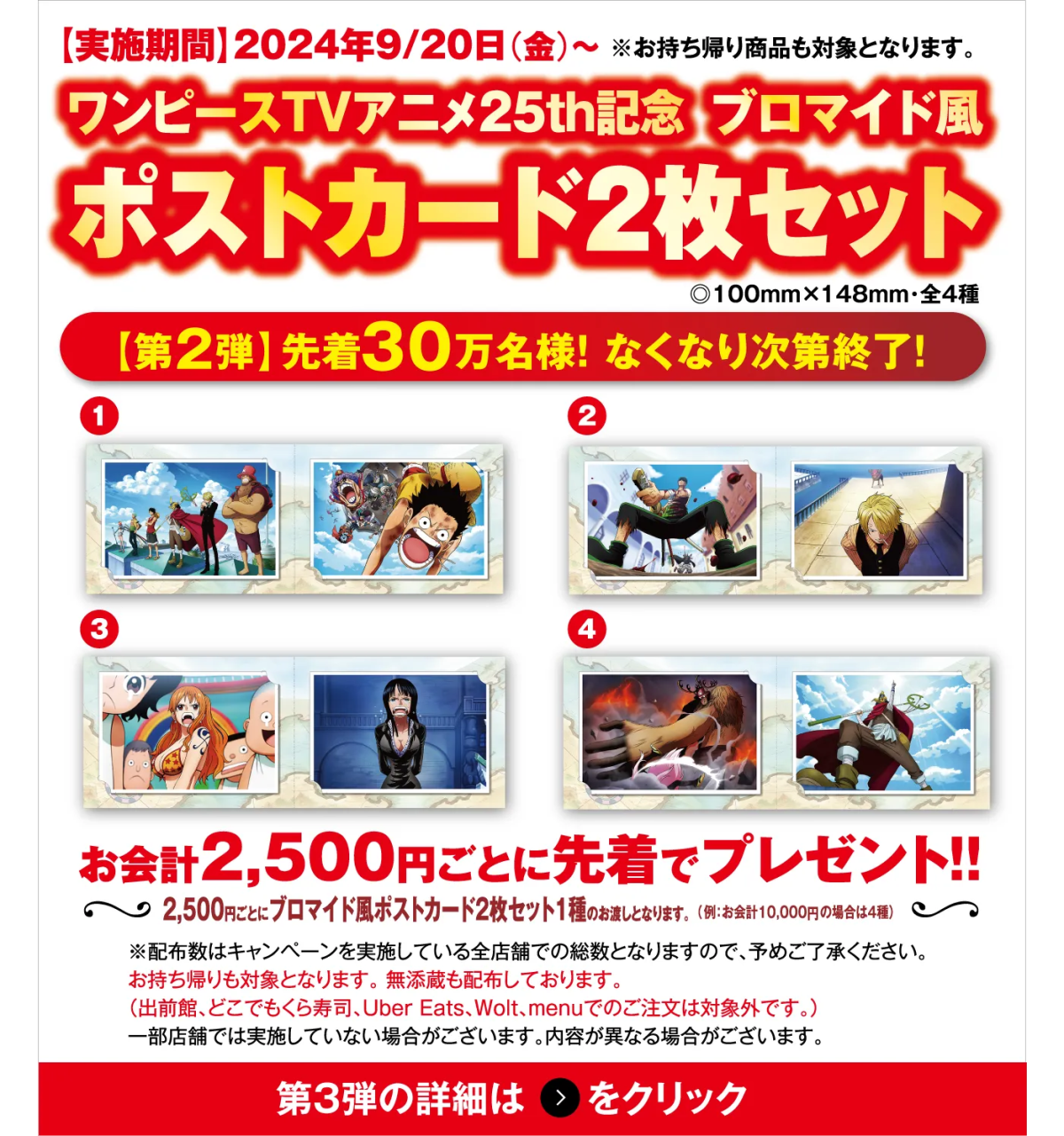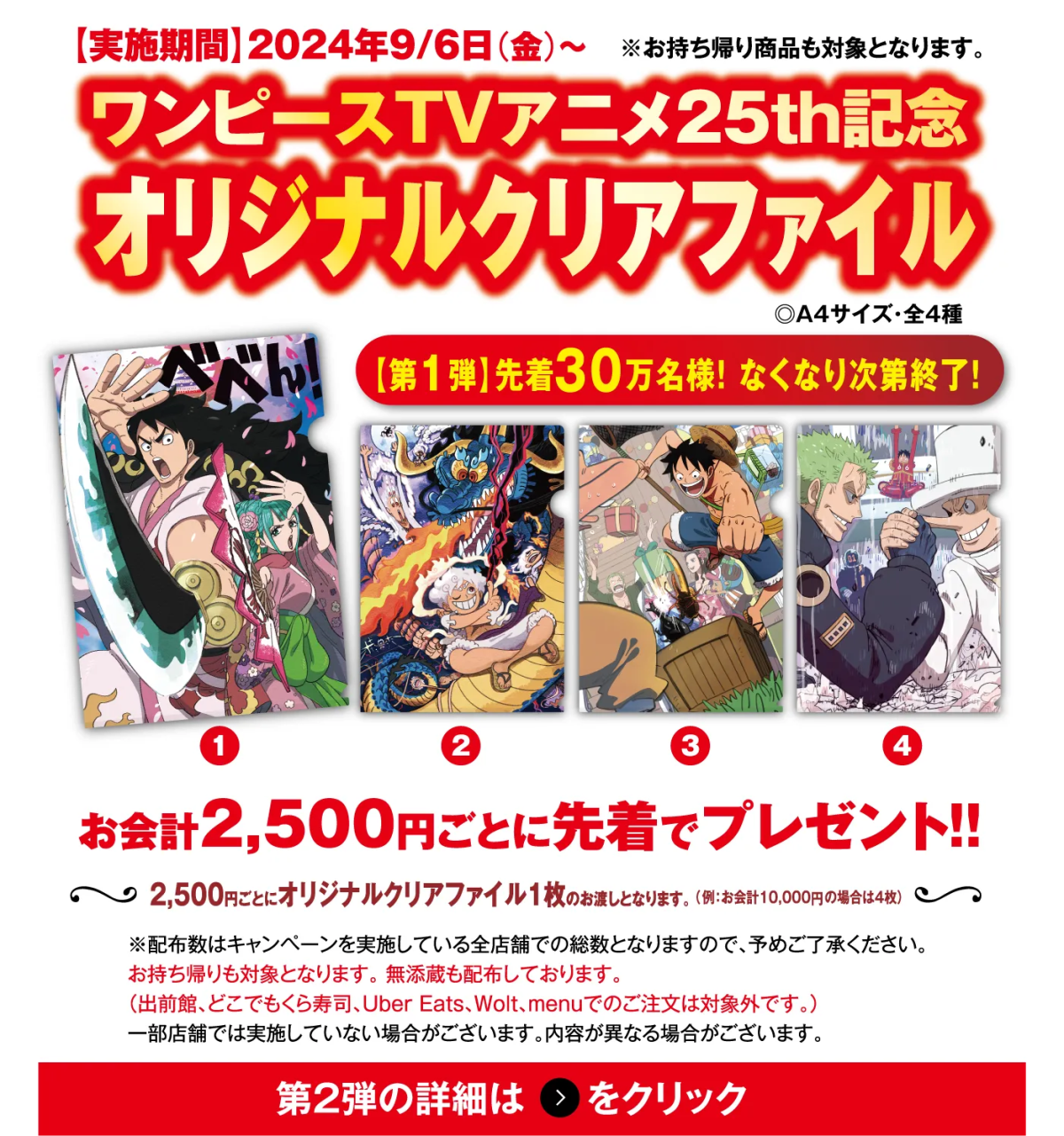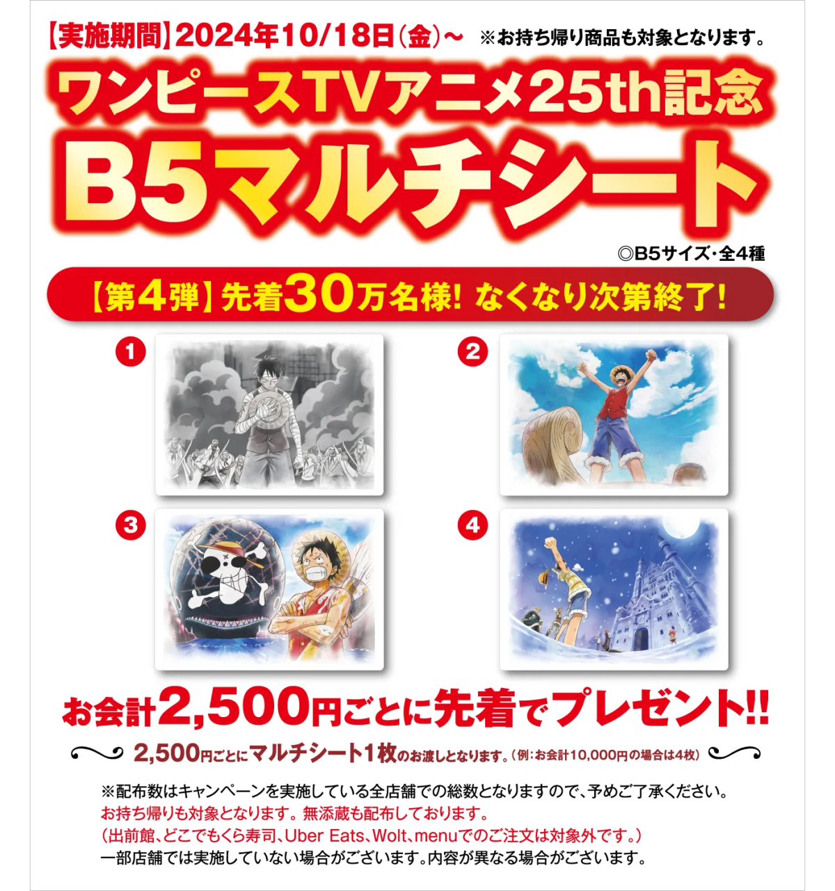 近日日本藏壽司則和動畫邁入 25 周年的《ONE PIECE 航海王》聯名,推出合作菜色以及周邊商品,當然還有招牌抽獎活動,將於 2024 年 9 月 6 日正式在日本各地店鋪展開。