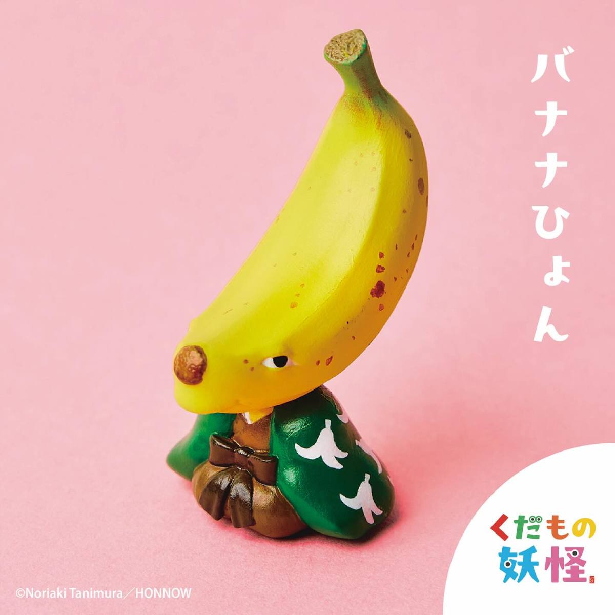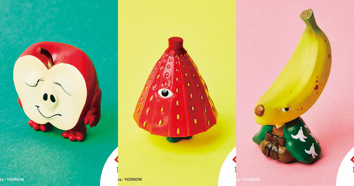 這次的「水果妖怪」包含草莓唐傘小僧、蜜柑大禿、哈密瓜坊主、蘋果肉怪,以及香蕉滑瓢(以上名稱為暫譯),不僅充分發揮了谷村紀明獨到的設計風格,更是巧妙地將水果形體與妖怪形象相互結合,比方說草莓與傘妖的形狀非常重合、哈密瓜坊主自帶的密瓜浪底座、把整顆蜜柑當作顏面奇大無比的大禿,而把蘋果半剖並長出四肢、製作成腐肉怪的創意相當有趣,直接把頭部變成一整根香蕉的老人妖怪滑瓢也很可愛。