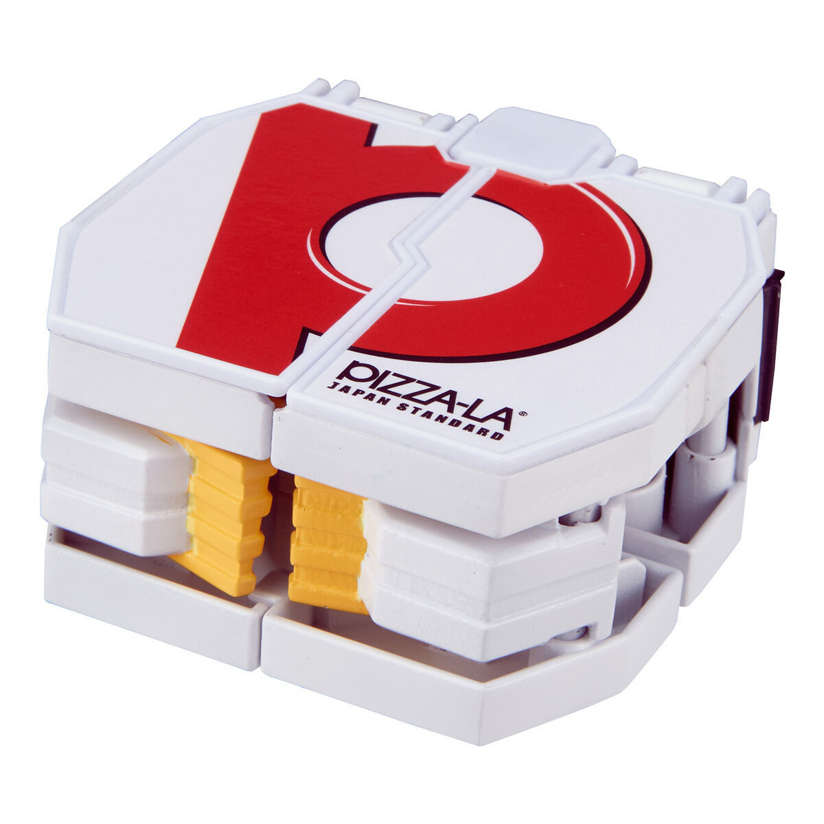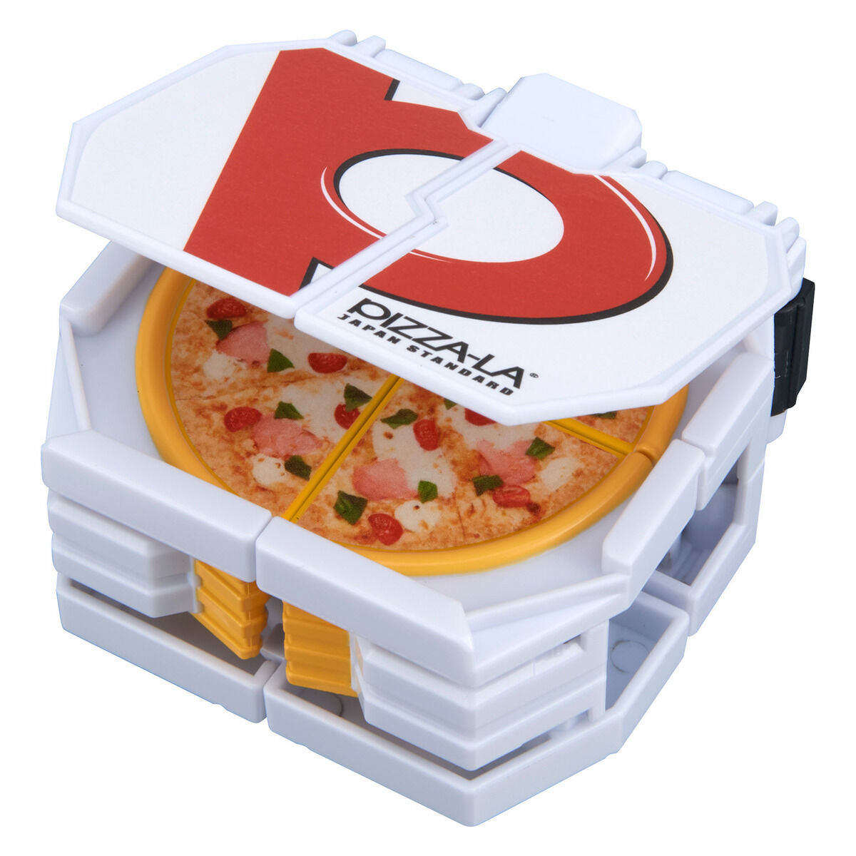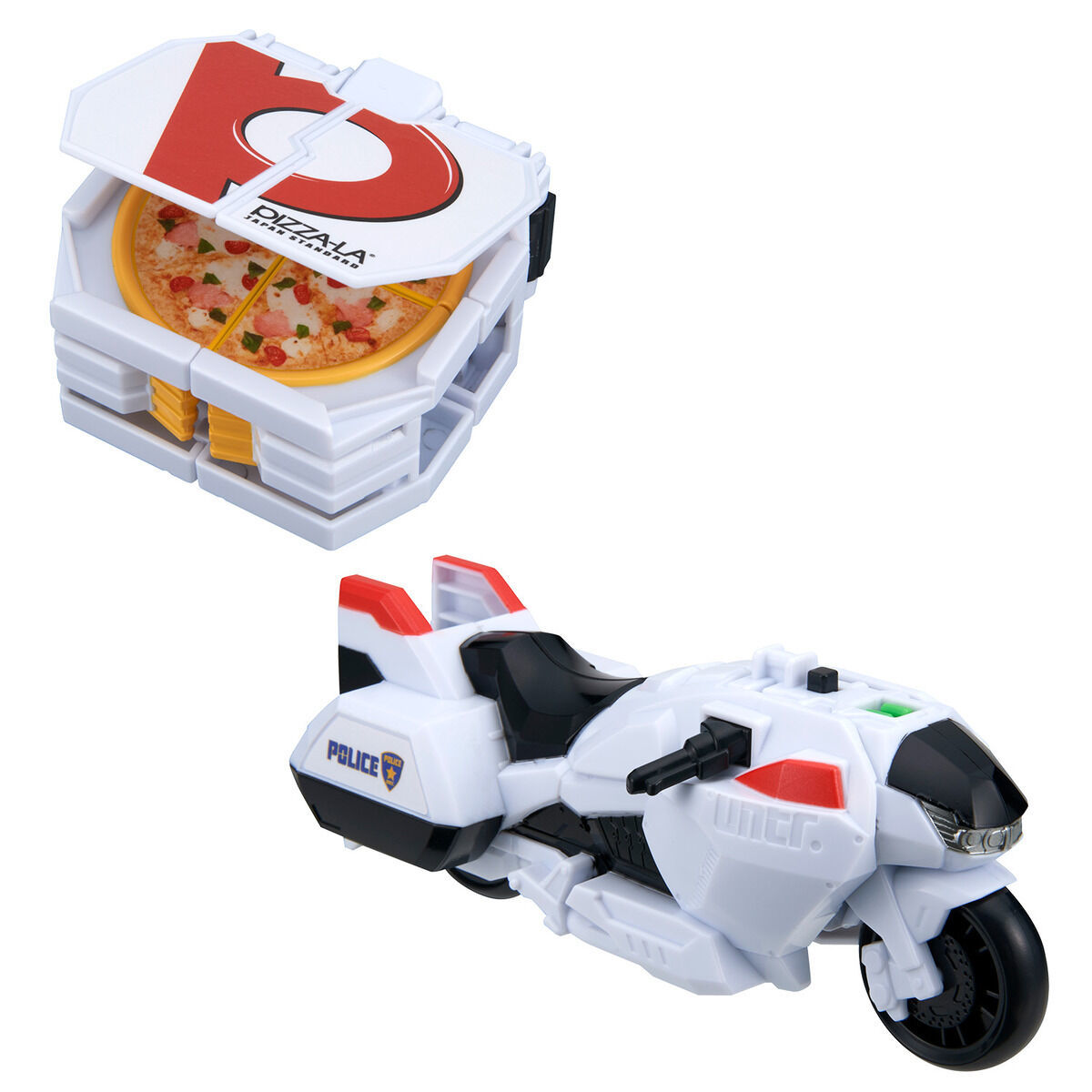 此次商品由 FOUR SEEDS 公司協力製作,使用 PIZZA-LA 實際披薩盒的資料進行開發,不僅透過印刷方式再現披薩盒上的 LOGO 與豐富的披薩配料,更為其設計出極具創意的變形合體機構,只要運用合體接點將披薩盒與警用摩托車連結,它們就會自動展開、變形完成合體!