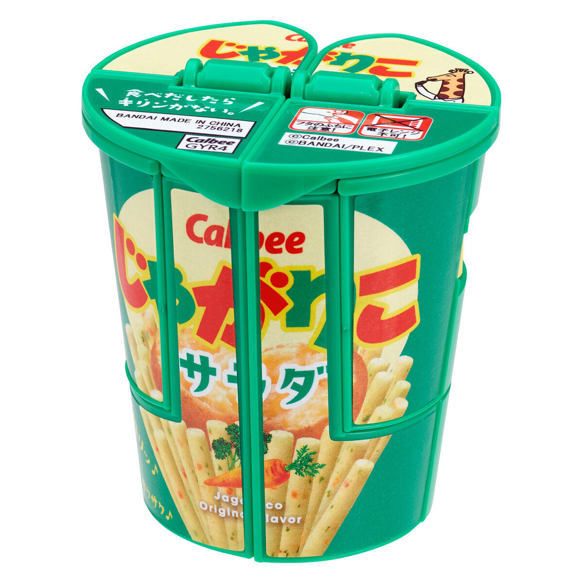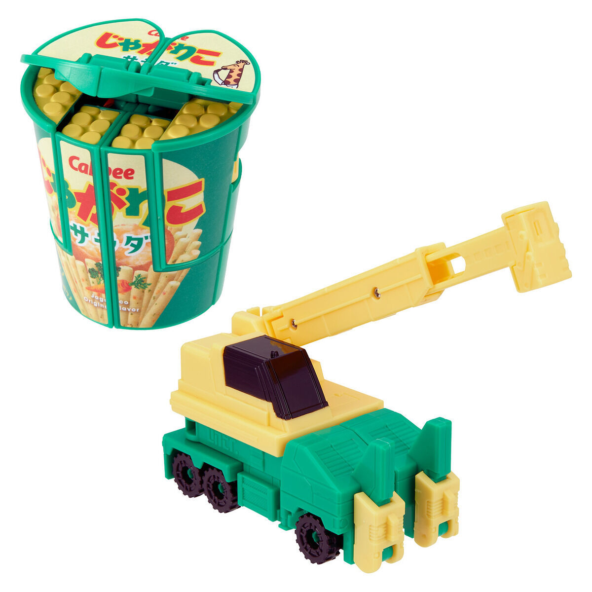此次商品由卡樂比公司協力製作,使用 Jagarico 實際商品包裝的資料進行開發,不僅忠實再現零食杯上的包裝圖樣與杯中的馬鈴薯條,更為其設計出極具創意的變形合體機構,只要運用合體接點將零食杯與起重機連結,它們就會自動展開、變形完成合體!