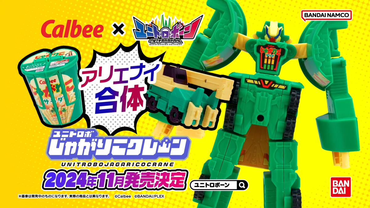 由日本萬代玩具公司所發行的變形合體機器人玩具『UNITROBORN』系列,發表了與日本卡樂比公司超人氣零食商品『Jagarico(じゃがりこ)』合作的最新商品「UNITROBO Jagarico起重機」預計於 2024 年 11 月發售的消息。