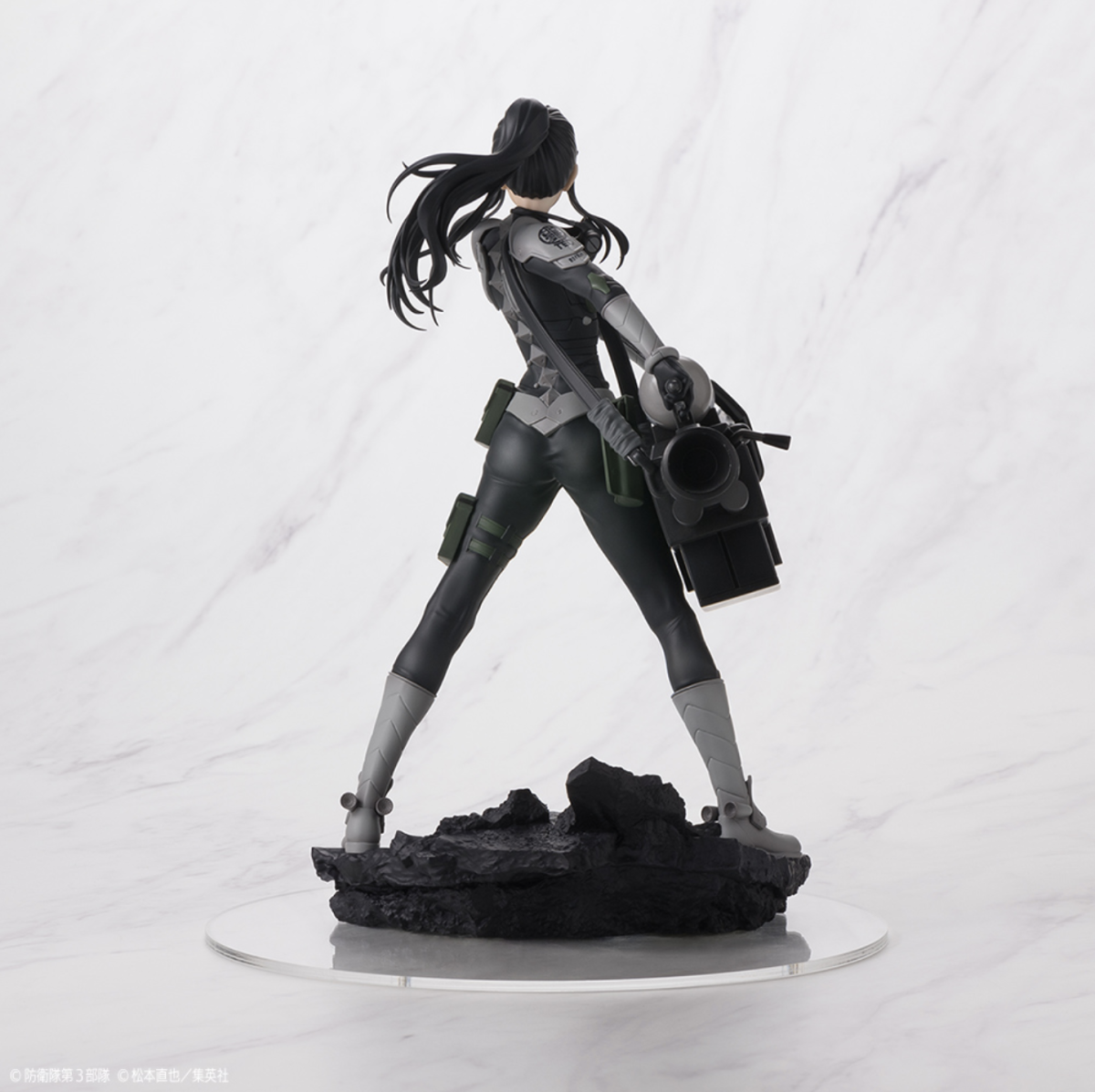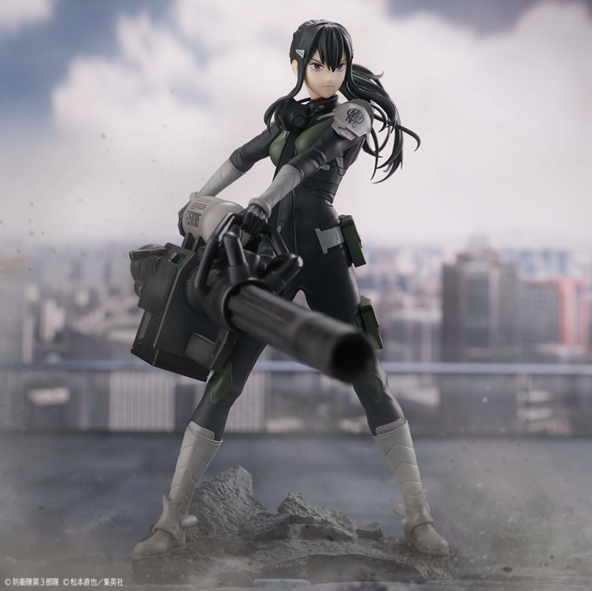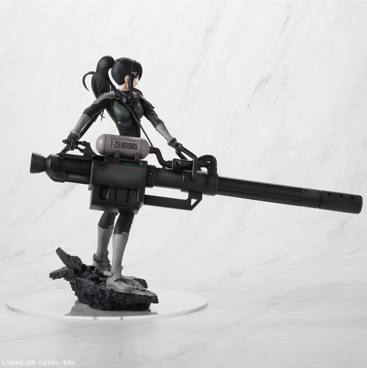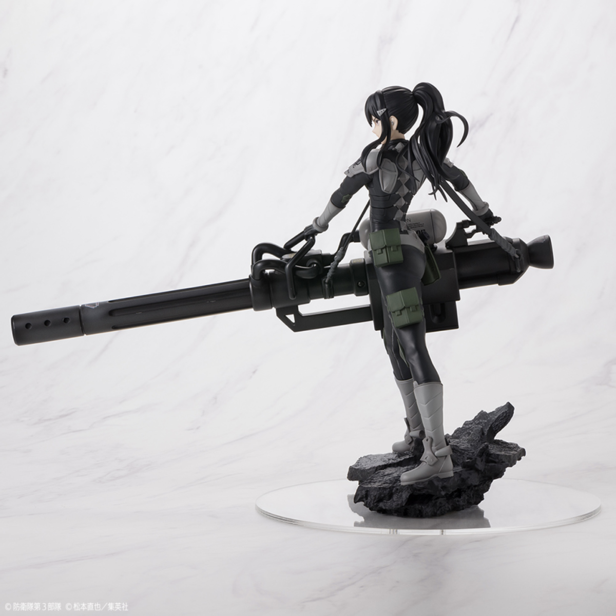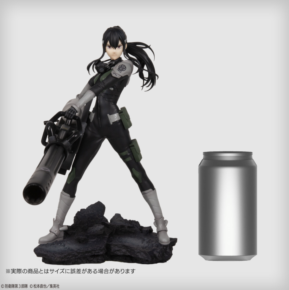 本次的亞白米娜 1/7 比例塗裝完成品全高約 23 公分,以米娜穿著雲科技戰鬥服、手持超大武裝重型狙擊炮的形象打造,細緻的雕刻再現她馬尾飄逸的動態以及從緊身的戰鬥服隱約透露的結實身體線條,塗裝出她堅毅的眼神以及眼角的淚痣等細節,槍身以及肩甲上的各式圖案也透過印刷也一併還原,底座碎裂的地台造型更展現出在被怪獸破壞的城市中奮戰的臨場感!