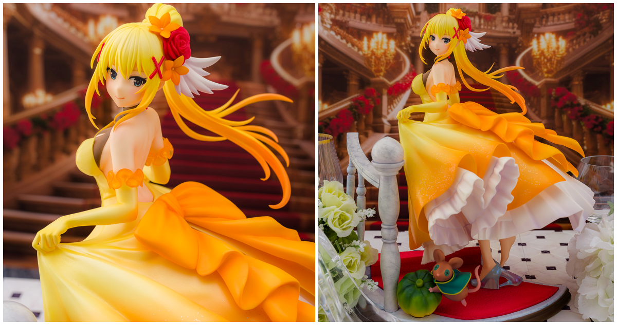 PROOF「達克妮絲 童話ver.」1/7比例模型,以灰姑娘童話故事為靈感,讓達克妮絲換上原創設計的灰姑娘禮服,並有富麗堂皇的階梯做為場景底座。仔細刻畫撩起裙子的優美姿,除了禮服一身鵝黃至橘色的漸層色調之外,在裙襬更是施以閃亮亮的亮片塗裝,營造更加華麗的質感!腳踩著珠光色彩的玻璃鞋,一隻玻璃鞋意外鬆脫的橋段也融入其中。腳邊還有以和真為造型的小老鼠趴在南瓜上,提醒灰姑娘該回家了~