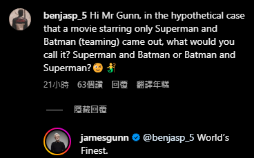 跟往常一樣,這樣簡單的貼文很快就讓在意DCU未來走向的粉絲,開始湧上這篇貼文提出問題。其中一名叫做@Benjasp_5的網友則問岡恩,如果未來有一部超人與蝙蝠俠組隊的電影,那會怎麼決定這部片的命名。