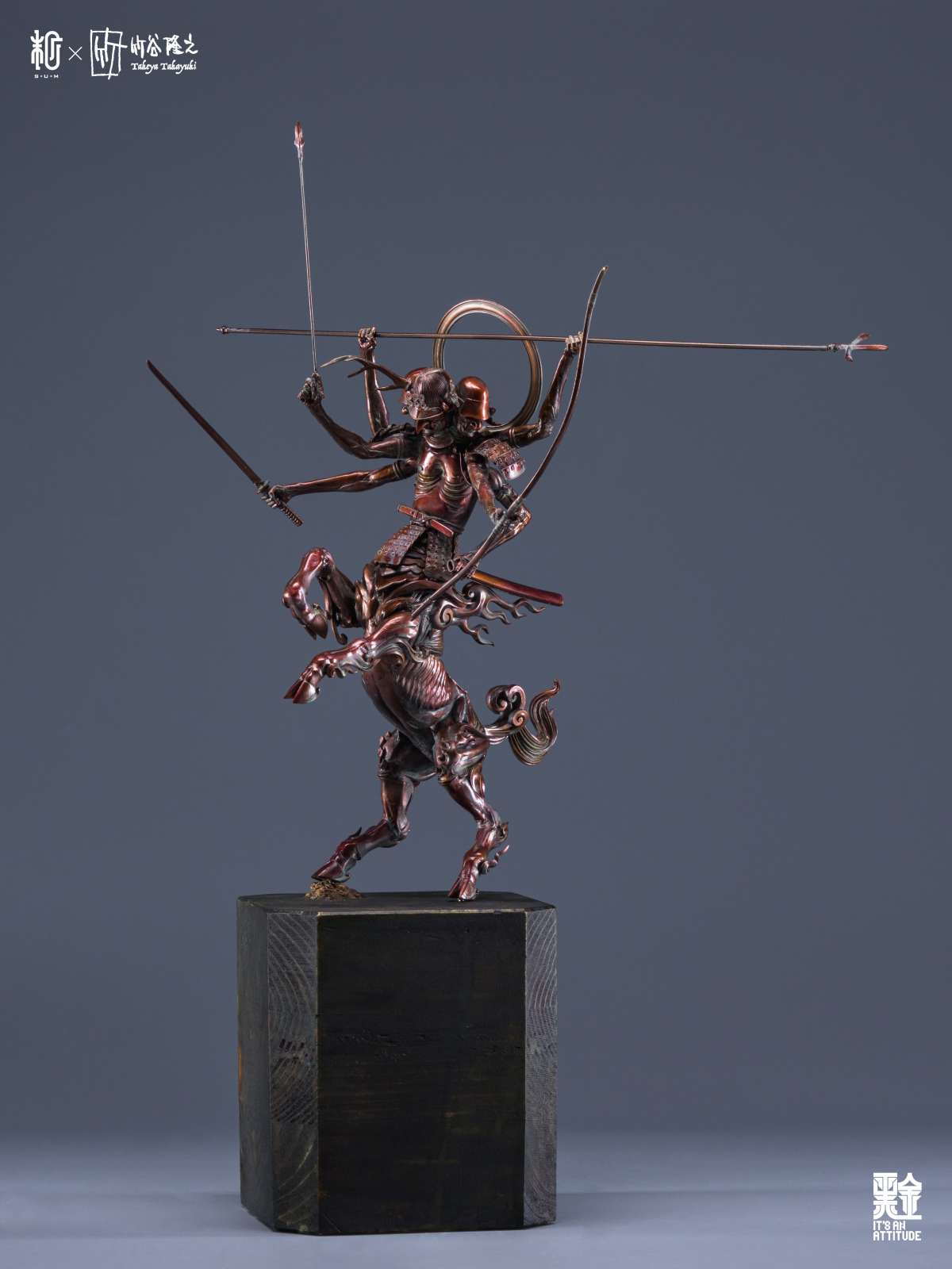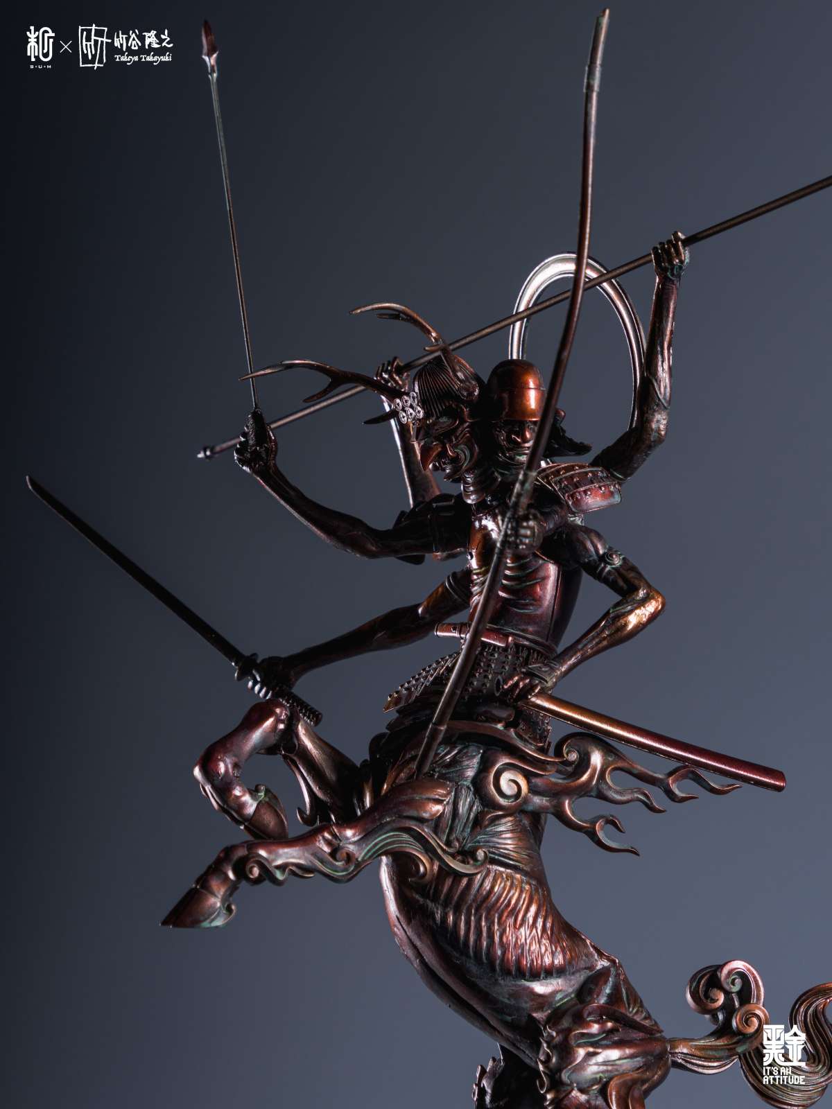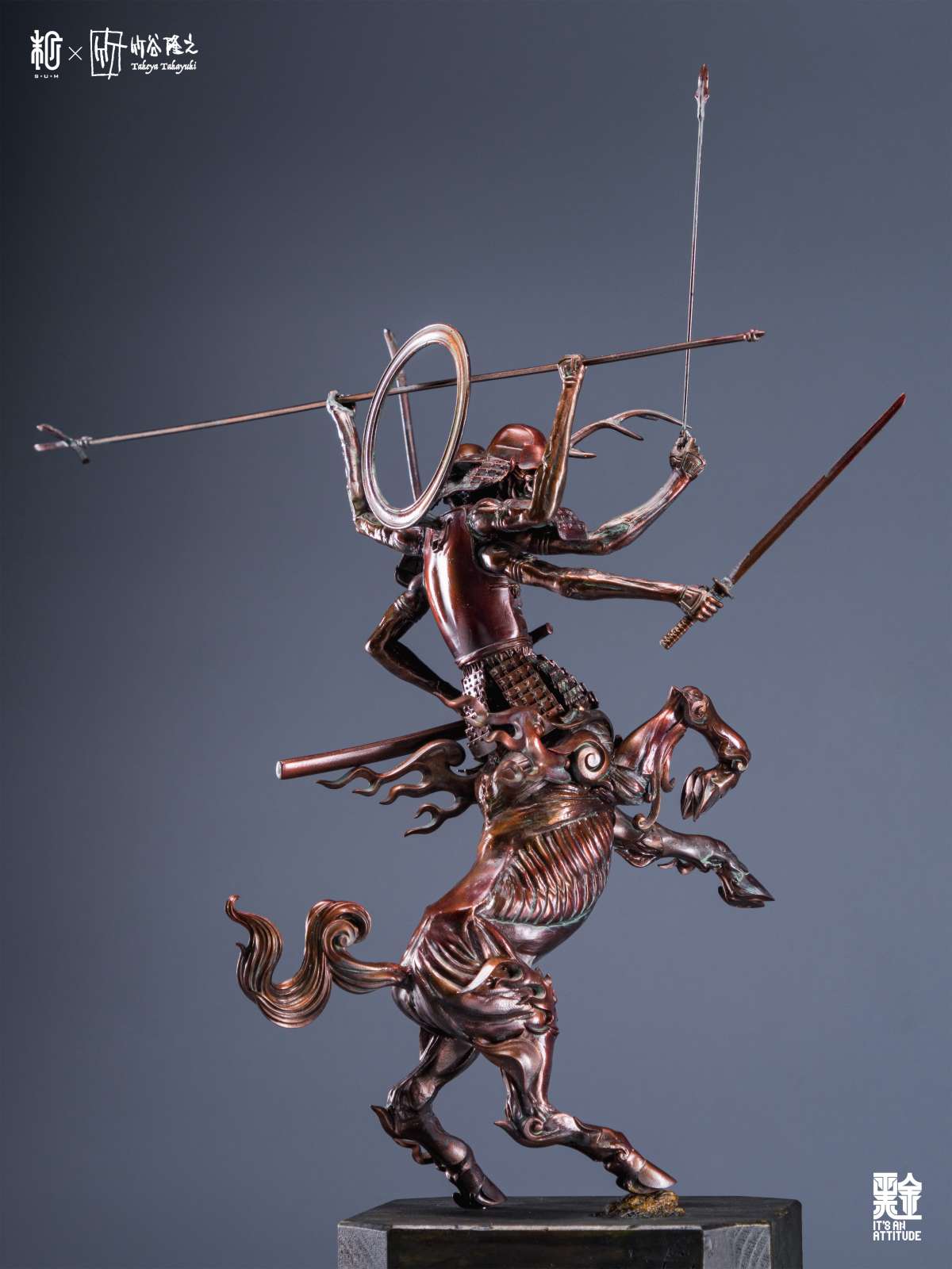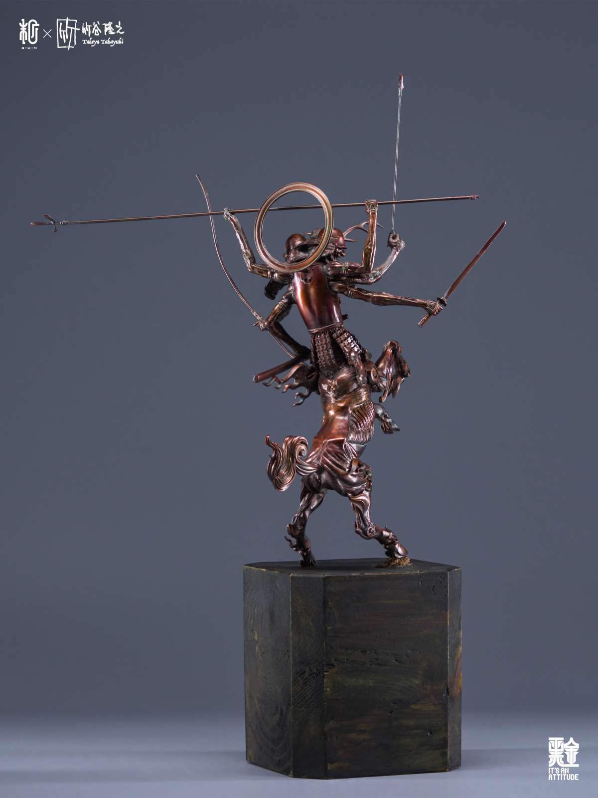 本作全高來到 42 公分,真田阿修羅半馬天本體採用樹脂為材料、武器選用金屬,底座則是以木頭製作,融合了東方神佛與戰國武將元素,再加上高高舉起的馬身,從任何角度看都是魄力滿滿,而在盔甲的刻畫、細瘦骨感的軀體形塑都充分表現了竹谷隆之的造型見解,表面隨處可見的銅鏽處理更是大大提升了這款完成品的真實感,搭配拿持武器的手臂,真的非常出色!