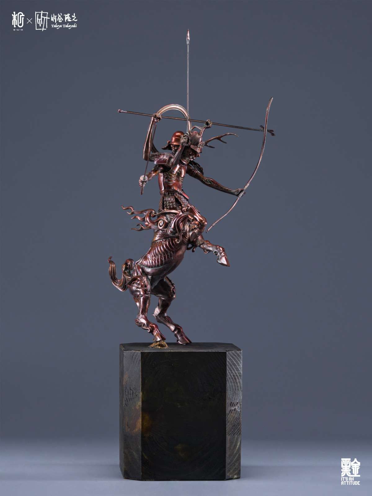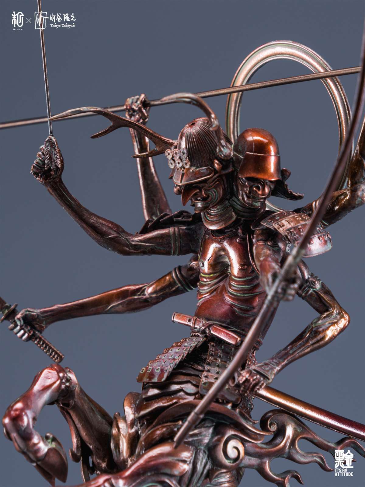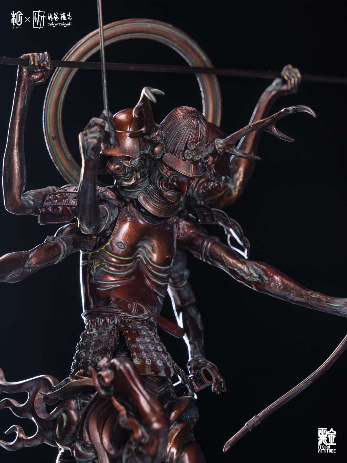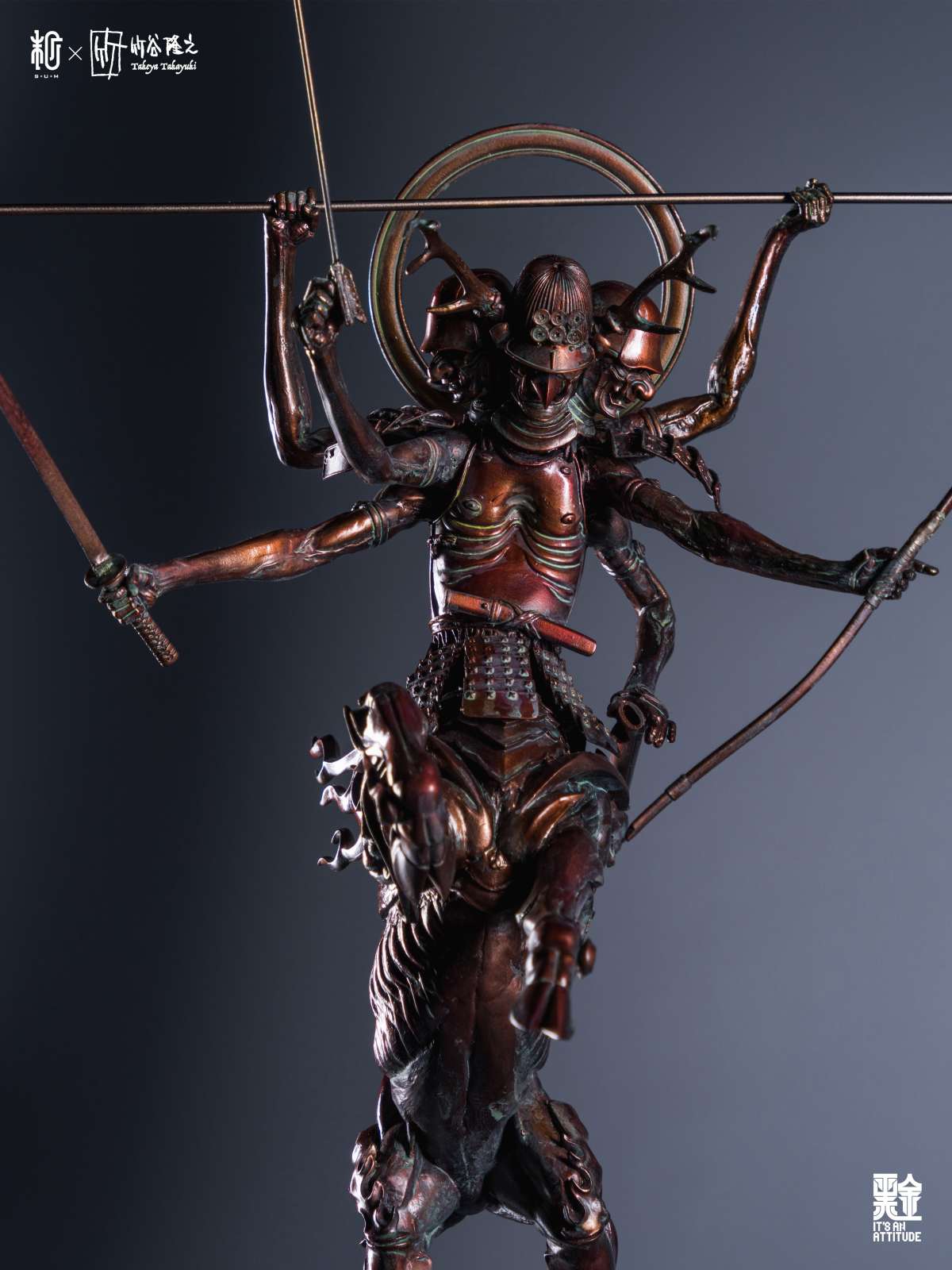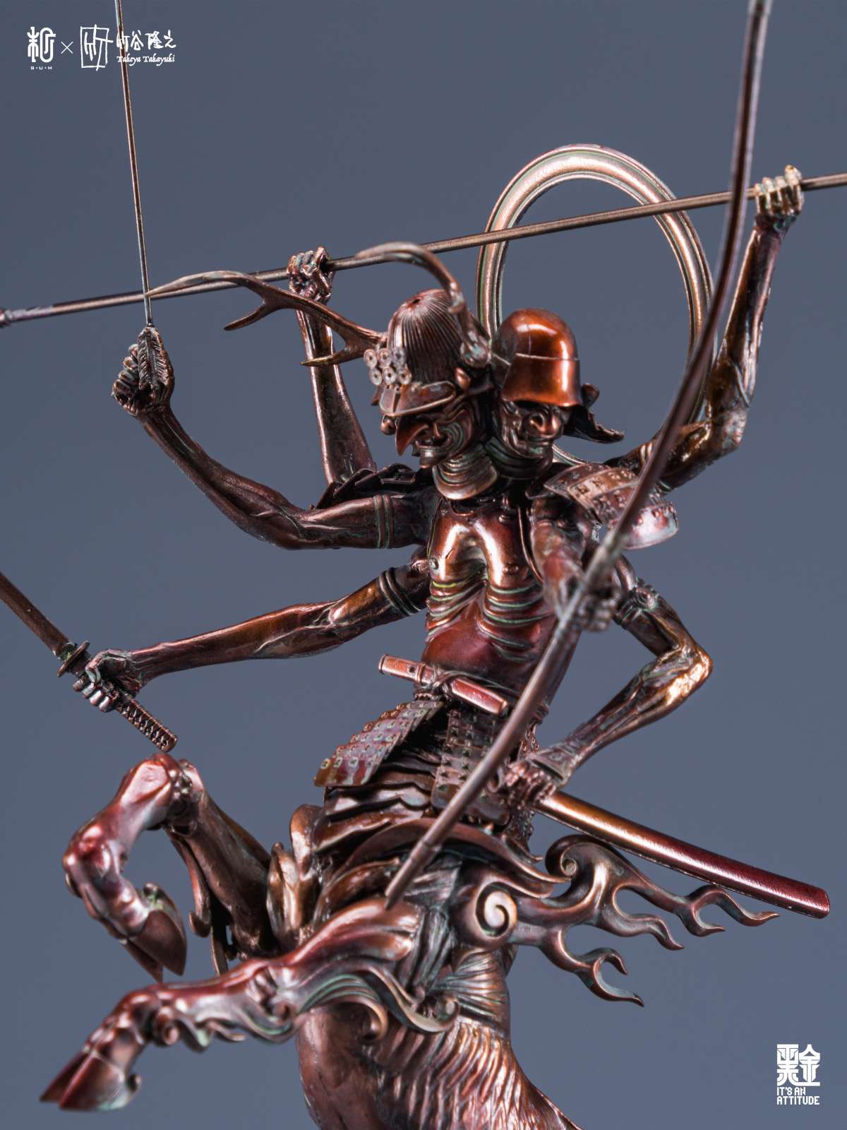 本作全高來到 42 公分,真田阿修羅半馬天本體採用樹脂為材料、武器選用金屬,底座則是以木頭製作,融合了東方神佛與戰國武將元素,再加上高高舉起的馬身,從任何角度看都是魄力滿滿,而在盔甲的刻畫、細瘦骨感的軀體形塑都充分表現了竹谷隆之的造型見解,表面隨處可見的銅鏽處理更是大大提升了這款完成品的真實感,搭配拿持武器的手臂,真的非常出色!
