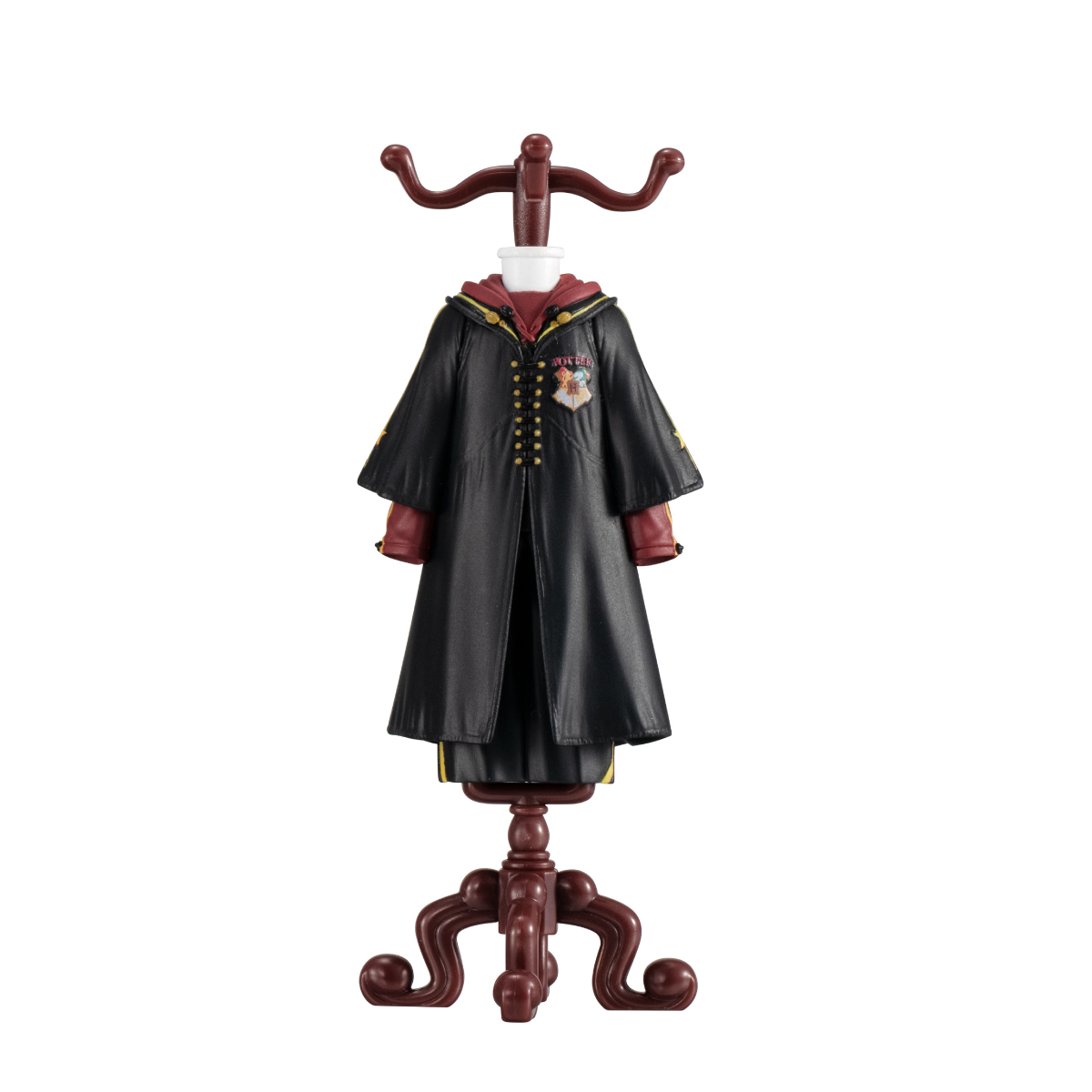 這一款轉蛋玩具的內容有立體化的魔法學校制服跟漂亮精美的木質感衣架,全高來到 9 公分,充分展現了風格迥異的設計與色彩,霍格華茲制服在右胸口製作出四大學院的紋章與 POTTER 的字樣,波巴洞、德姆蘭學院制服不只附上了帽子,服裝的細節與面料的質地差異也有很不錯的呈現,跟第一彈的霍格華茲四大學院制服共同搭配展示吧。