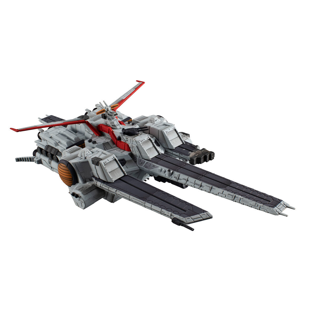 戰艦底部的主砲「超絕MEGA粒子砲」能透過替換零件方式再現砲口展開狀態,機動戰士的格納庫也能替換再現艙門展開的狀態。配件中還附有剎帝利補修型、報喪女妖命運女神型、疾風卡爾斯、傑鋼(ECOAS規格機)等四架機動戰士的迷你模型,能放置在艦身上一同擺設。