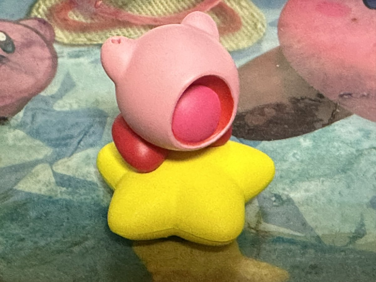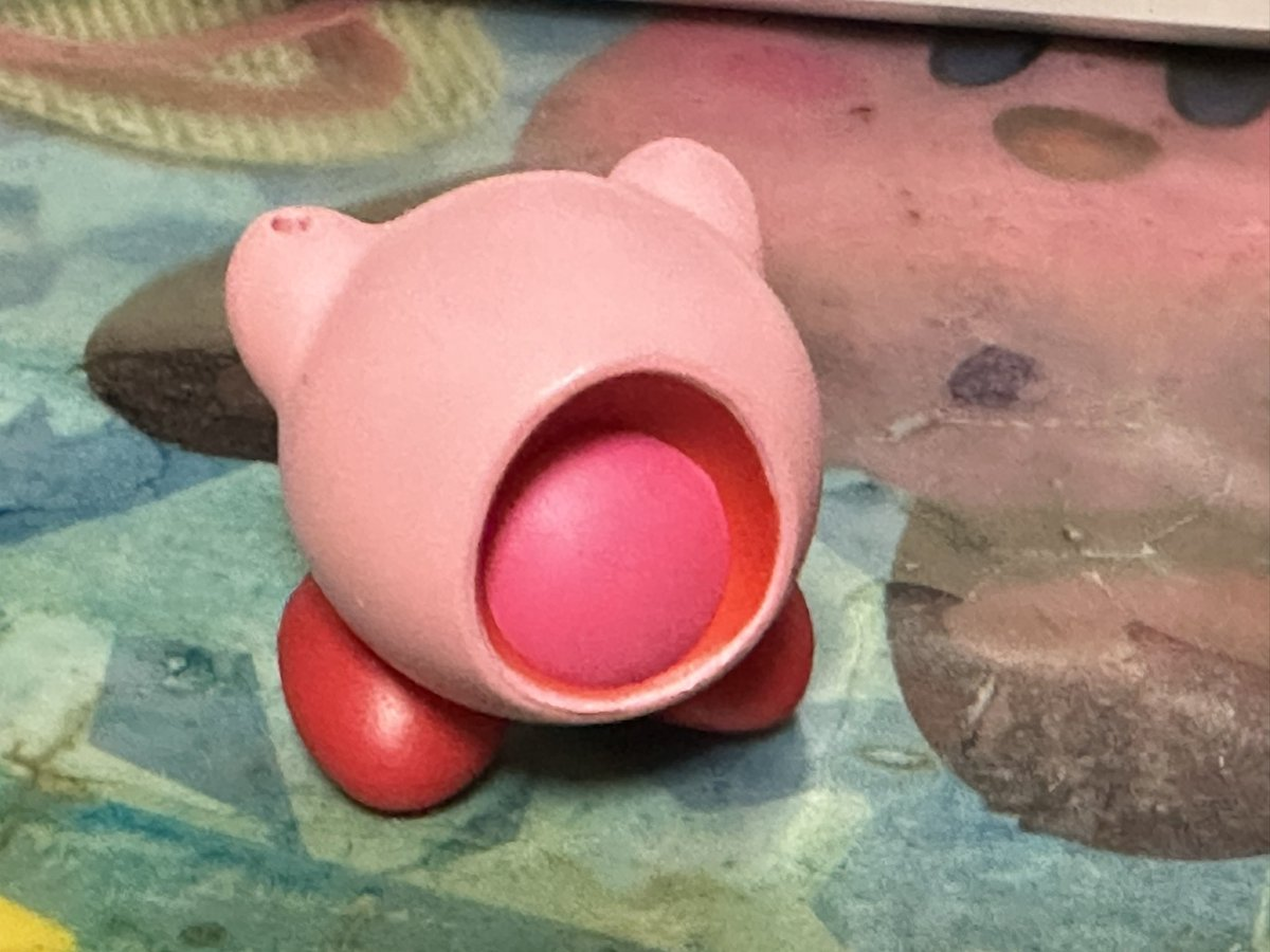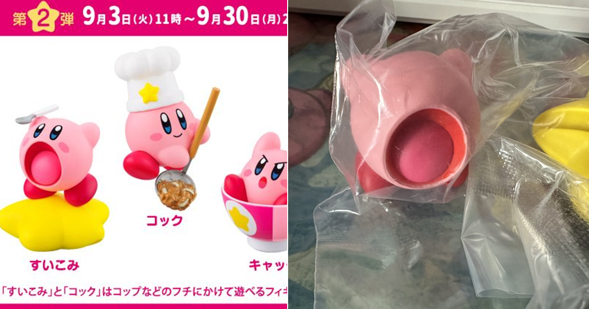這位推主購買到的張開大嘴的卡比款式,不過似乎忘了印上眼睛跟招牌的臉頰腮紅,變成一個...粉紅色球體張嘴的不明物,看起來好像有點可怕 XD。