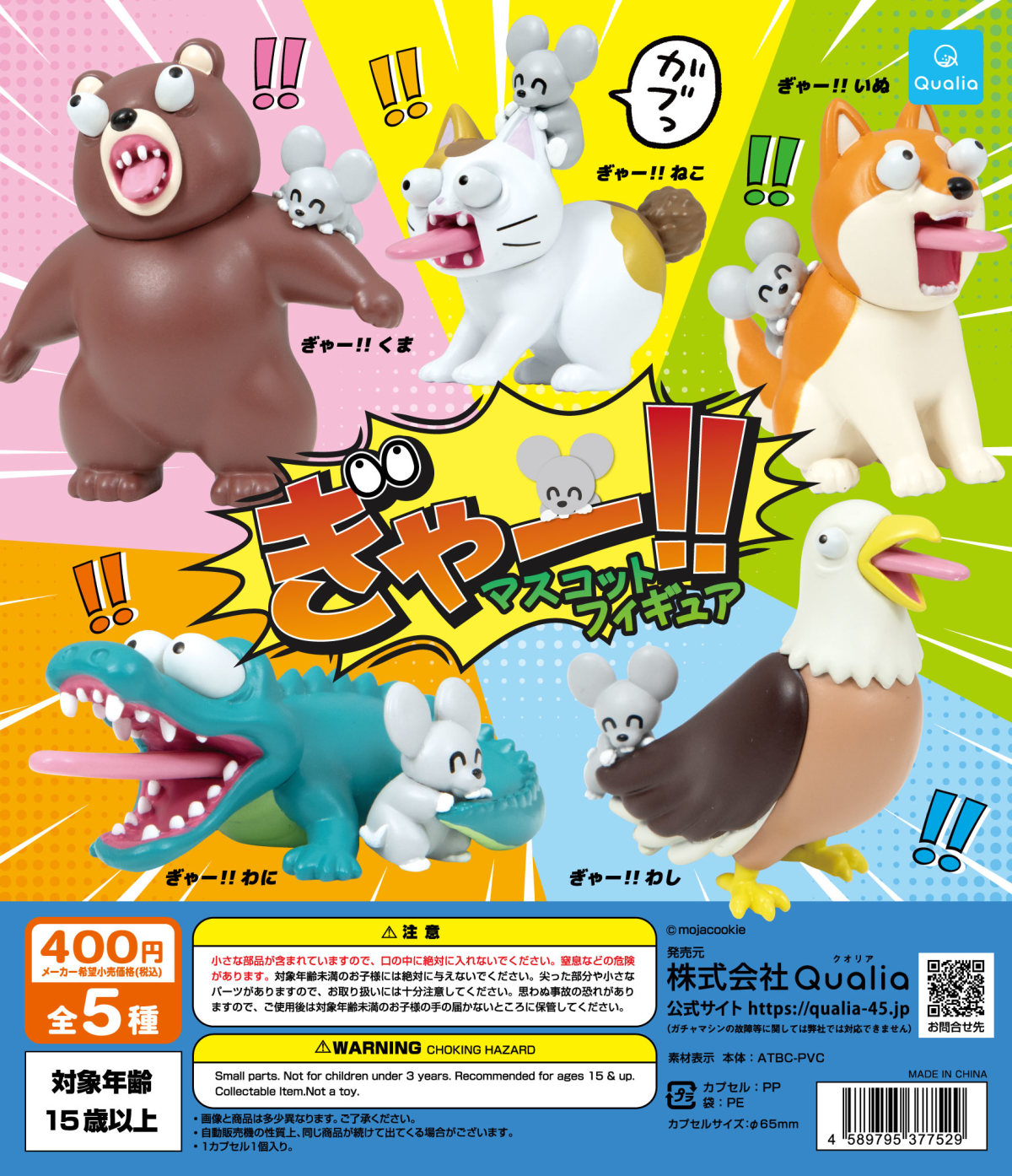 Qualia「呀ー!!」轉蛋,以各種動物被可愛的小老鼠咬到後,眼球噴出、痛苦吶喊的爆笑造型登場!收錄有:呀!!熊、呀!!貓、呀!!狗、呀!!鱷魚以及呀!!老鷹,除了熟悉的漫畫式尖叫臉超好笑之外,凸出的眼睛、嘴裡的牙齒也細膩呈現,完全可以讓人感受到那股猛爆式的崩潰...尤其犯案的小老鼠還露出嘻嘻笑的表情,強烈反差非常有趣~