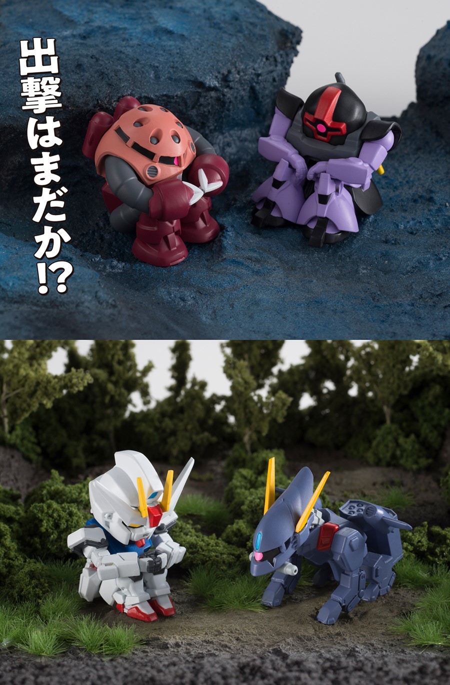 「等待中的機動戰士鋼彈2」轉蛋,以系列一貫的經典風格重新詮釋,在約 4 公分高的尺寸中,刻劃出人氣鋼彈機體:夏亞專用茲寇克、德姆、攻擊鋼彈、巴庫的特徵造型,並呈現雙手乖乖放在膝蓋上縮成一團、低著頭苦苦守候的姿勢,看起來很委屈的模樣又可愛又令人心疼,放在各種生活場景都有獨特的趣味!巴庫更是附屬有能夠拆裝的背部「450mm二連裝磁軌砲」,超級欠收!!