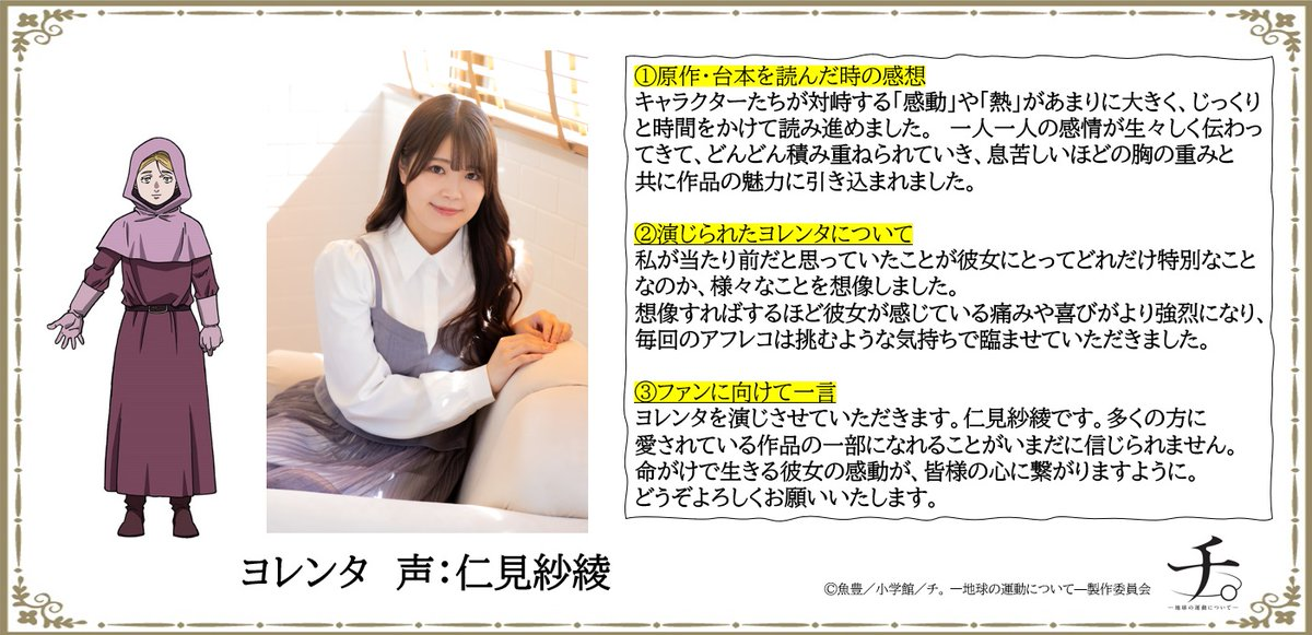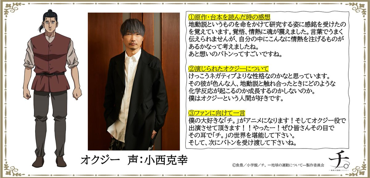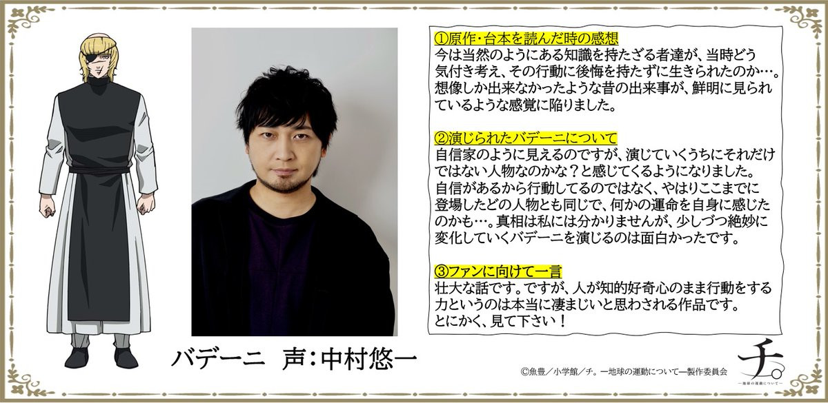 由漫畫家魚豐所創作的作品《地。-關於地球的運動-》(チ。-地球の運動について-),在 2022 年 6 月就宣布了要製作成電視動畫,由 MADHOUSE 來擔綱製作,今年 7 月正式宣布,將於 2024 年 10 月正式開播,讓不少粉絲感到興奮。